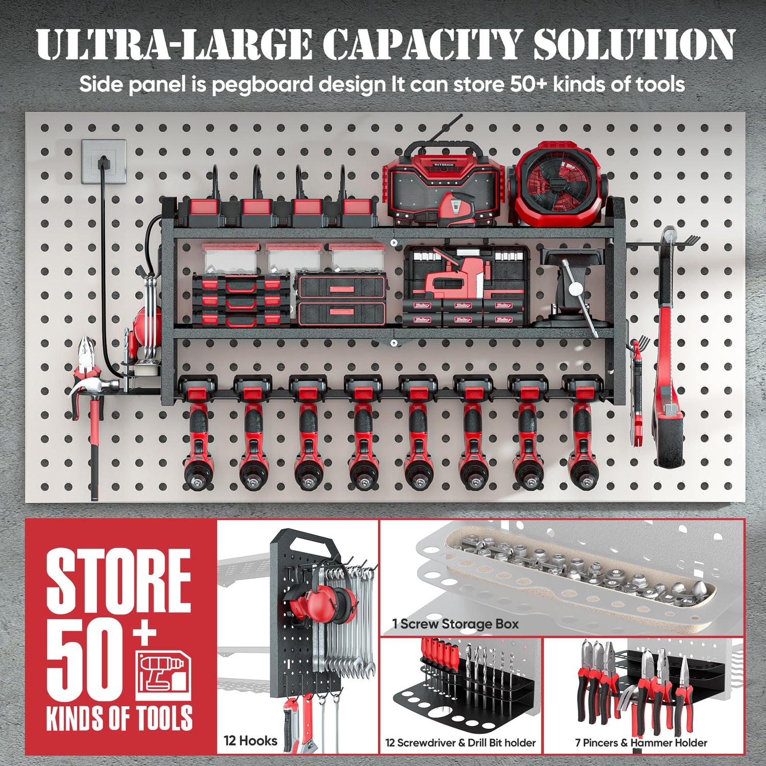 - Power Tool Organizer With Parts Organizer Box: Nacial power tool organizer is designed with 3 tiers, 8 dedicated slots. Side panel is pegboard design, can support 0.25-inch pegboard accessories, featuring 4 regular hooks and 8 S-hooks for tools,it's sturdy enough to support heavy tools. There's a toolbox with screw storage attached to the side for storing various tools such as commonly used drill bits, tweezers, screws, Bolts or other Small Parts Organizer, adding versatility to storage option