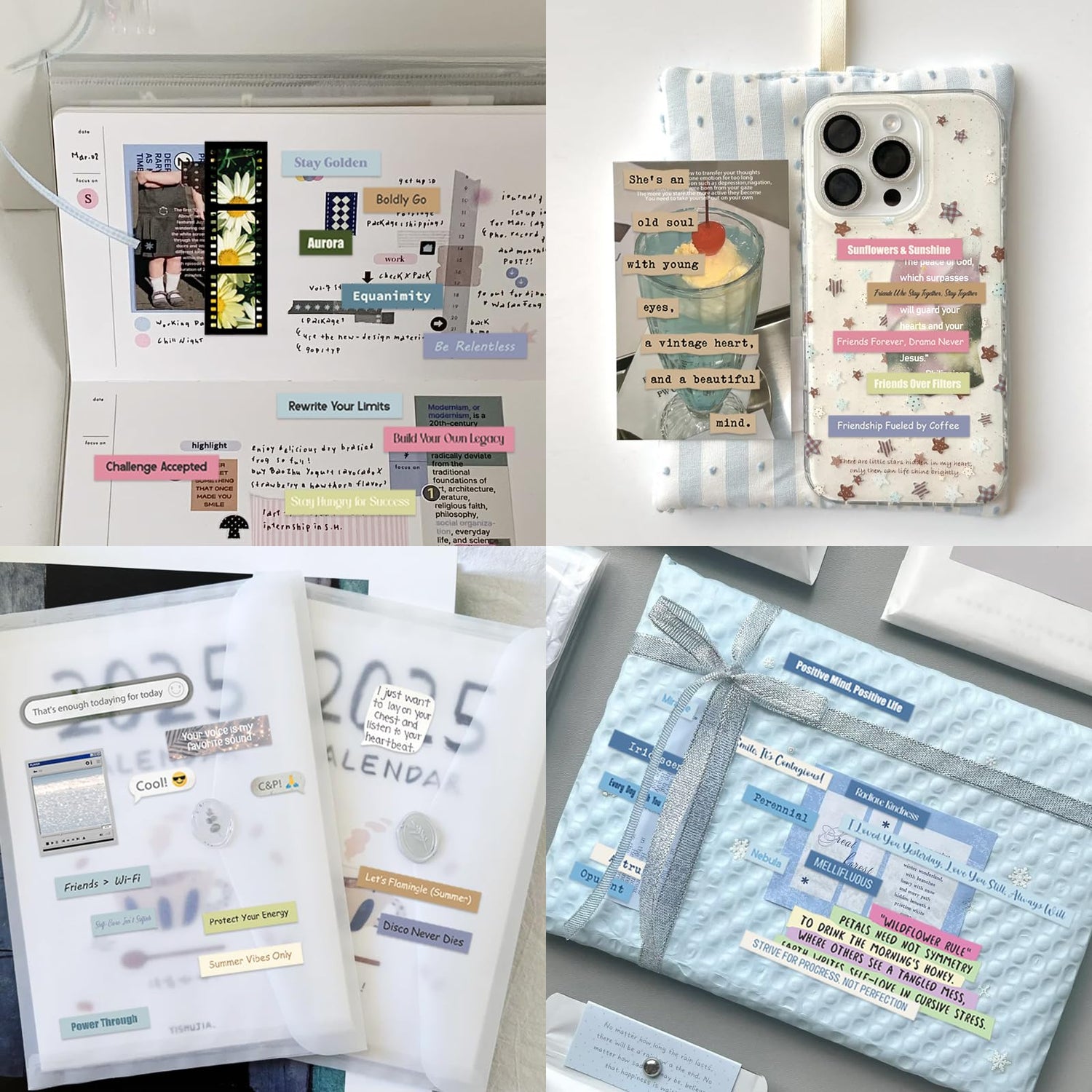 Details: Empower your creative journey with this 2346PCS Quote Stickers Kit designed for scrapbooking vision boards and journaling enthusiasts Each package contains 48 sheets of pre-cut motivational phrases across 6 color themes with 8 unique font styles per set—perfect for adults crafting expressive art journals bullet journals or inspirational vision boards The acid-free coated paper ensures fade-resistant durability while the included tweezer tool simplifies precise sticker placement Ideal for embellishing junk journal ephemera handmade cards or gift tags these vibrant stickers feature curated affirmations like "Dream Big" and "Be Your Best Self" with zero grammar errors With versatile sizes ranging from bold headlines to subtle accents this kit adapts to Vision Board Design: Layer quotes over collage backgrounds Bullet Journal Tracking: Motivate daily goals with color-coded tabs Memory Keeping: Preserve milestones in scrapbook layouts Gift Personalization: Add handwritten warmth to cards envelopes Measuring 4.33x6.69 inches the compact pad fits seamlessly into craft totes making it essential scrapbook supplies for travelers students or mindfulness practitioners Its non-toxic adhesive safely adheres to paper photos or corkboards without residue