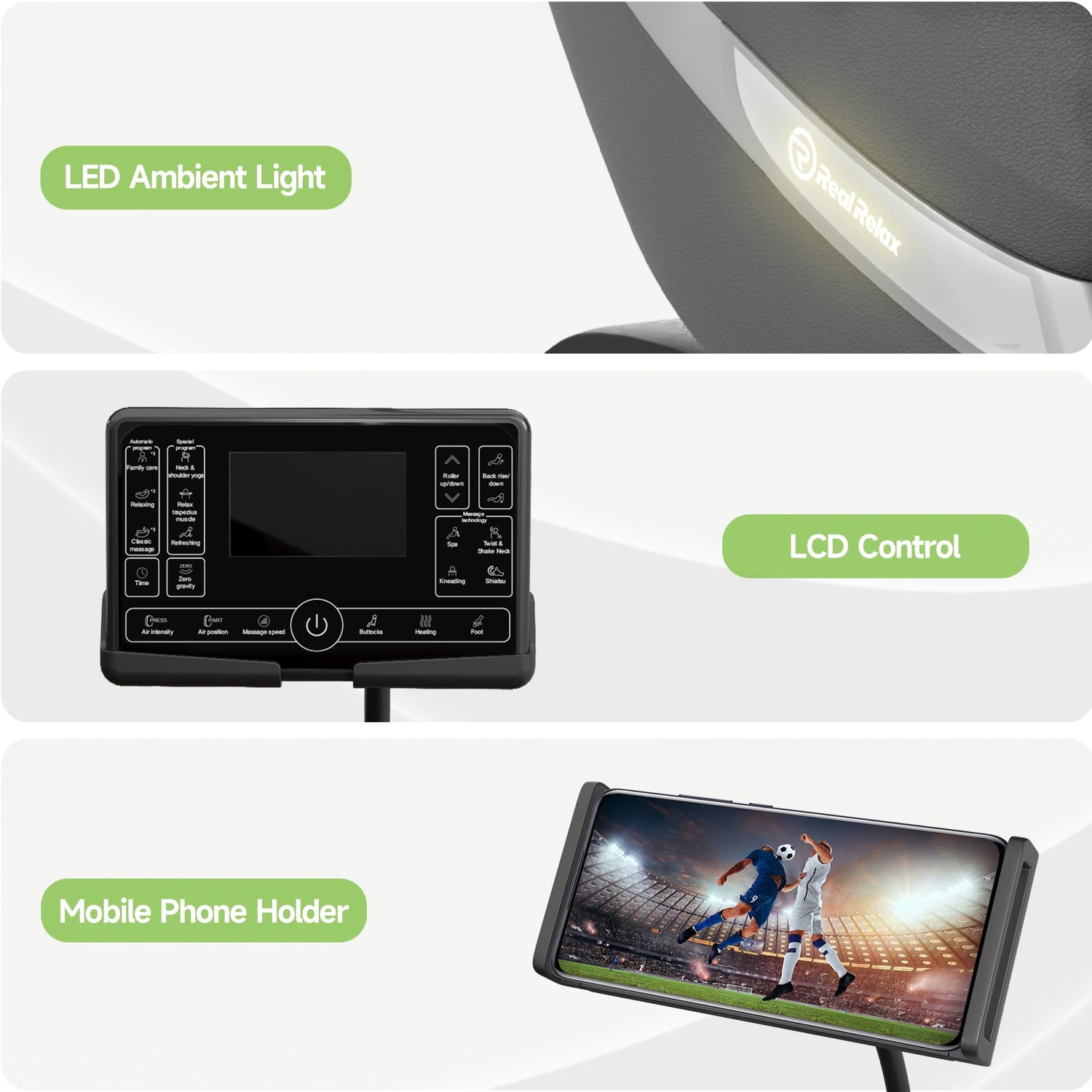 - Other Features: 3D surround Bluetooth player,LCD control screen,headrest and other functions. Compared with the FS01 massage chair,it also adds LED ambient light and mobile phone holder