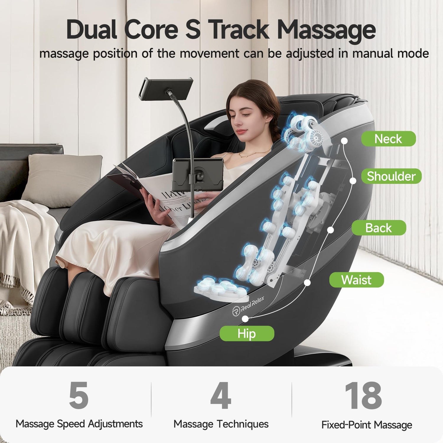 - Dual Core S-Track Massage: It can precisely and deeply relax key areas from the neck to the hips. It has the economy of a fixed-point roller massage chair and the mobility of an SL track massage chair
