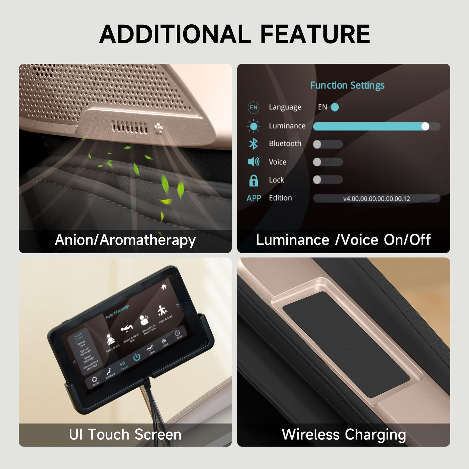 - 4D Roller & Shoulder Detection - Upgrade UI touch screen massage chair with adaptive 4 level 4D mechanism for personalized experience. Automatically customizes your massage experience by scanning your shoulder position, delivering whole, partial and fixed-point massage