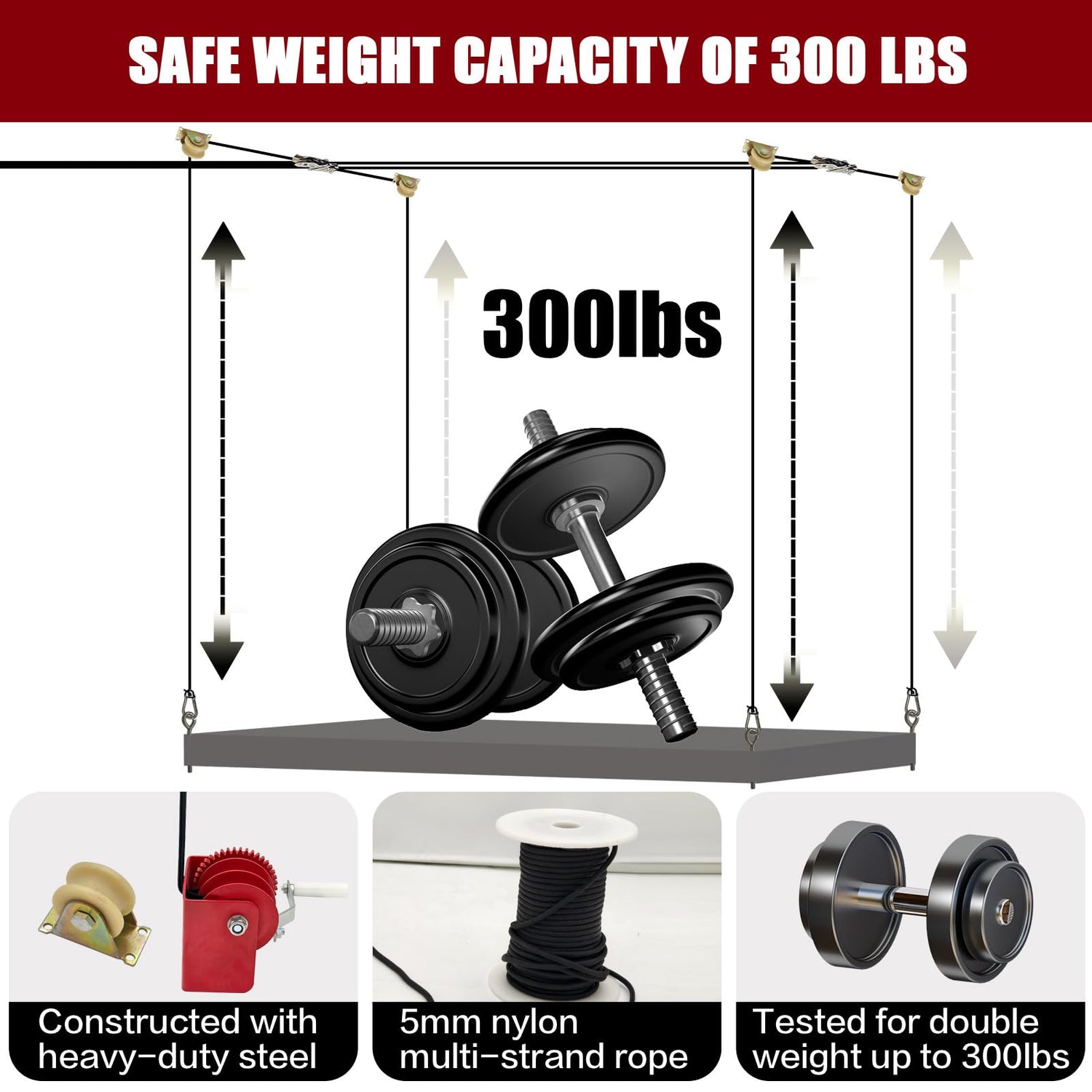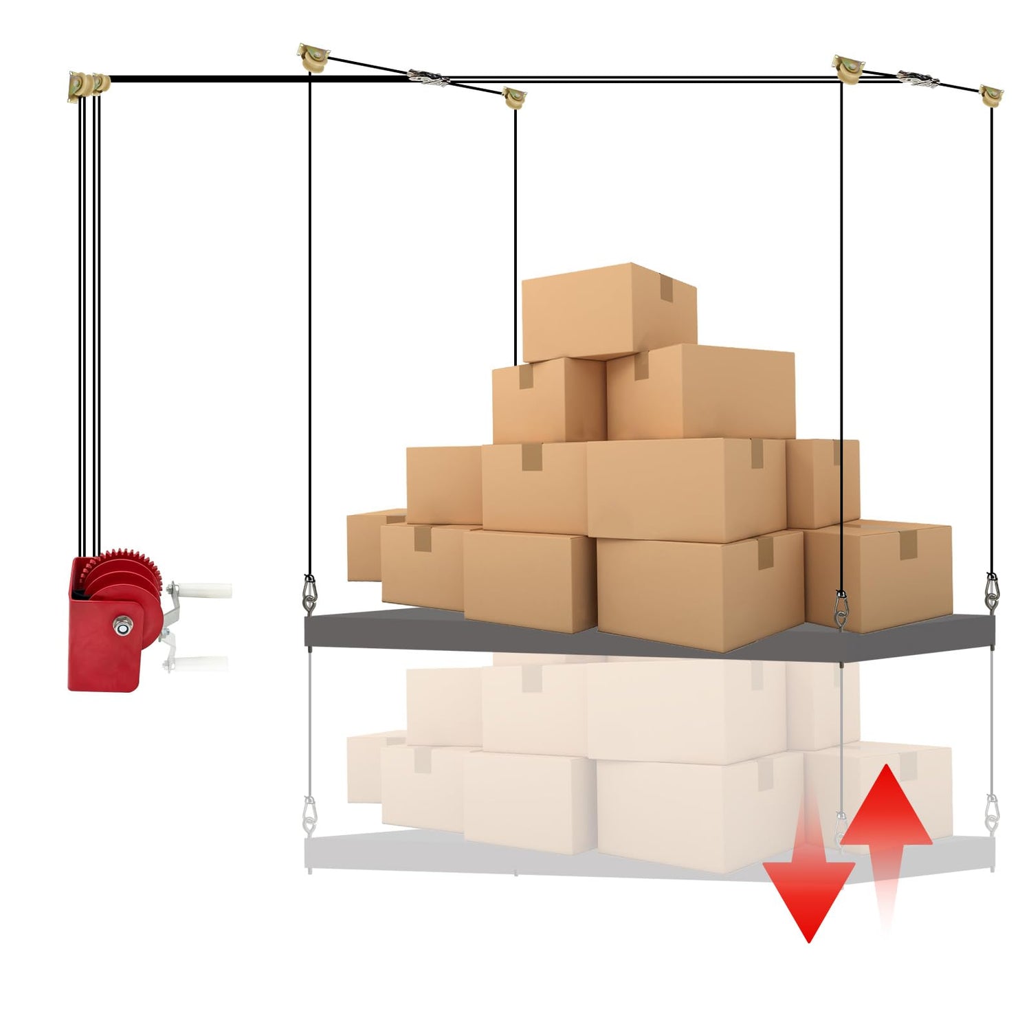 - EASY TO USE - Easily operated by one person. Our garage storage lift is equipped with a hand crank to ensure that items are easily lifted up to a maximum height of 16 feet with minimal effort, making it easy to place items without the need for a ladder.