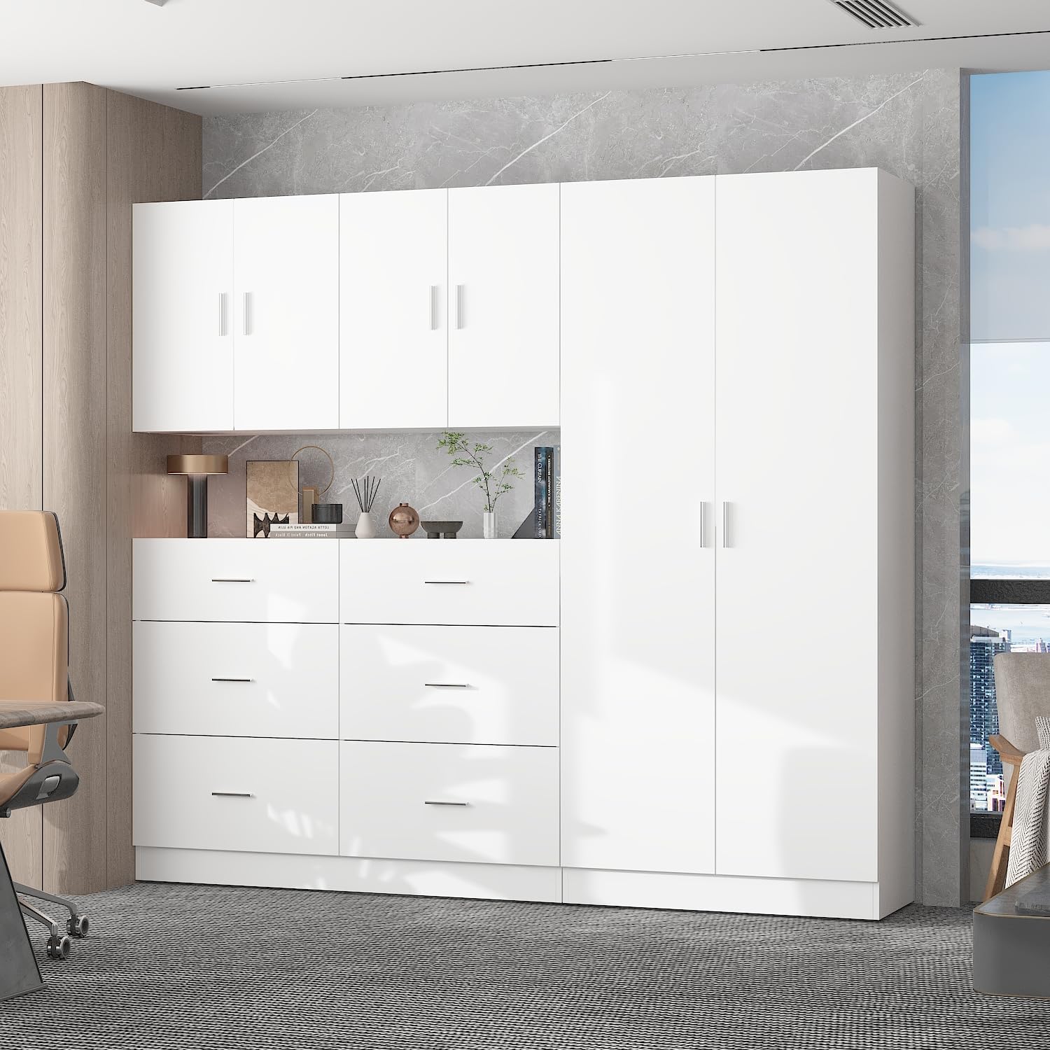 Details: ROMSHINE Large Garage Storage System with 6 Drawers, 3-Piece Workshop Cabinet Set with Wall Mounted Storage, Utility Bookshelf Pantry Cabinet for Home Office Shopping Malls Retail Console, White