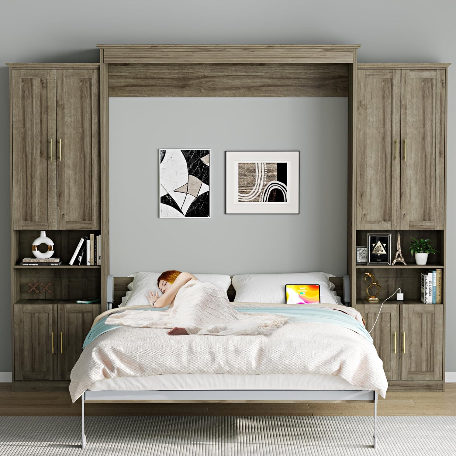 Rophefx Murphy Bed Queen with 2 Side Cabinet Storage Shelves, Queen Wall Bed Cabinet with USB Port, Wood Foldable Platform Bed Frame, Space Saving Beds, Modern Hidden Bed for Guest Room, Home, Grey