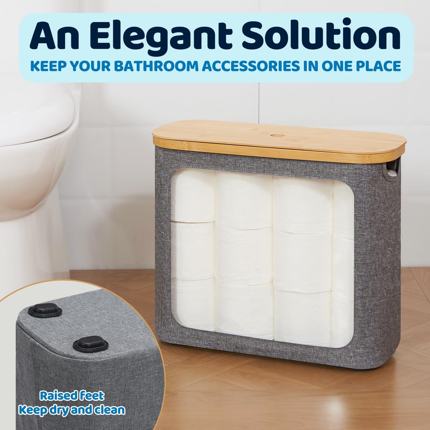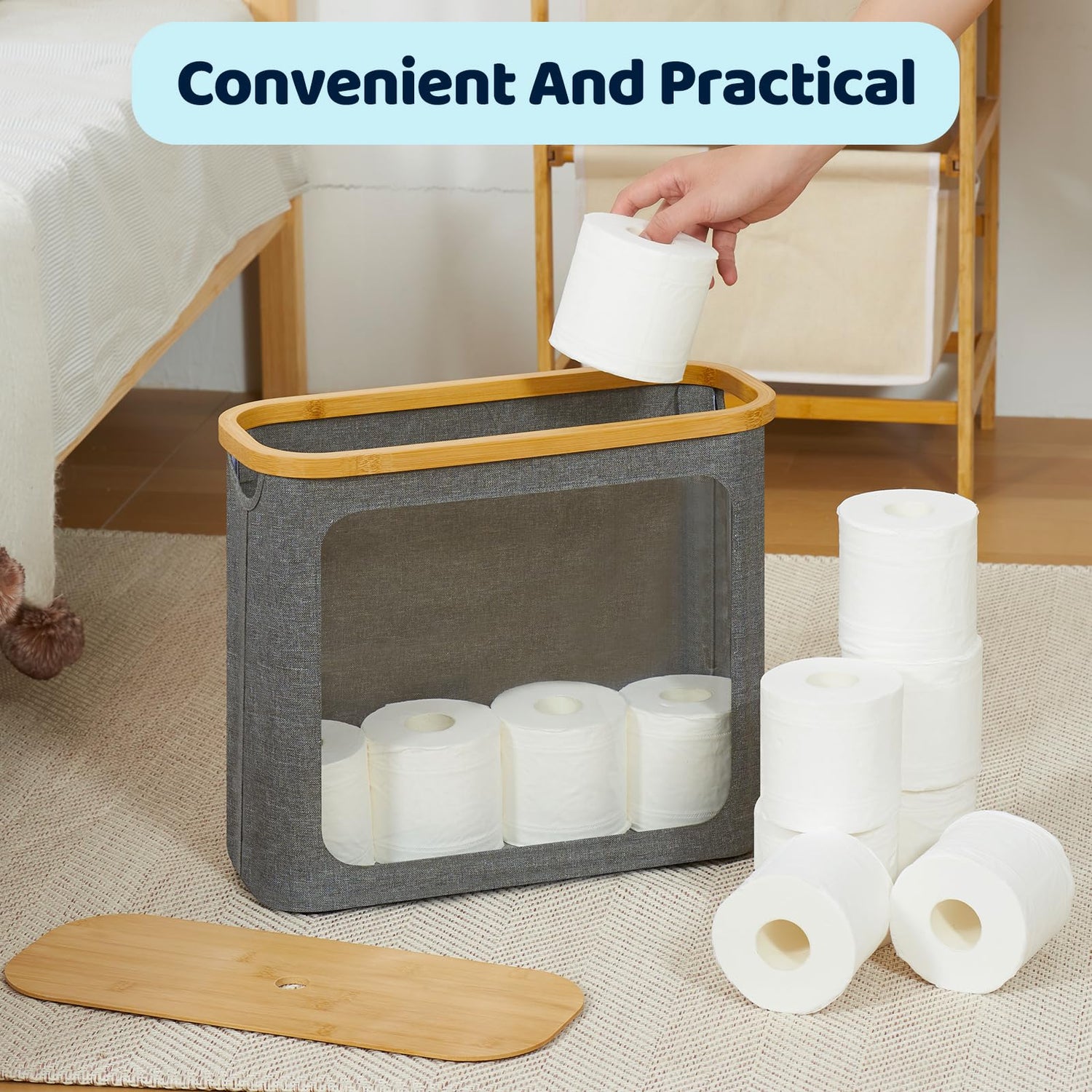 ROSOS Toilet Paper Basket, Toilet Paper Storage with Lid for 12 Rolls, Bathroom Storage Organizer with Bamboo Lid, Grey