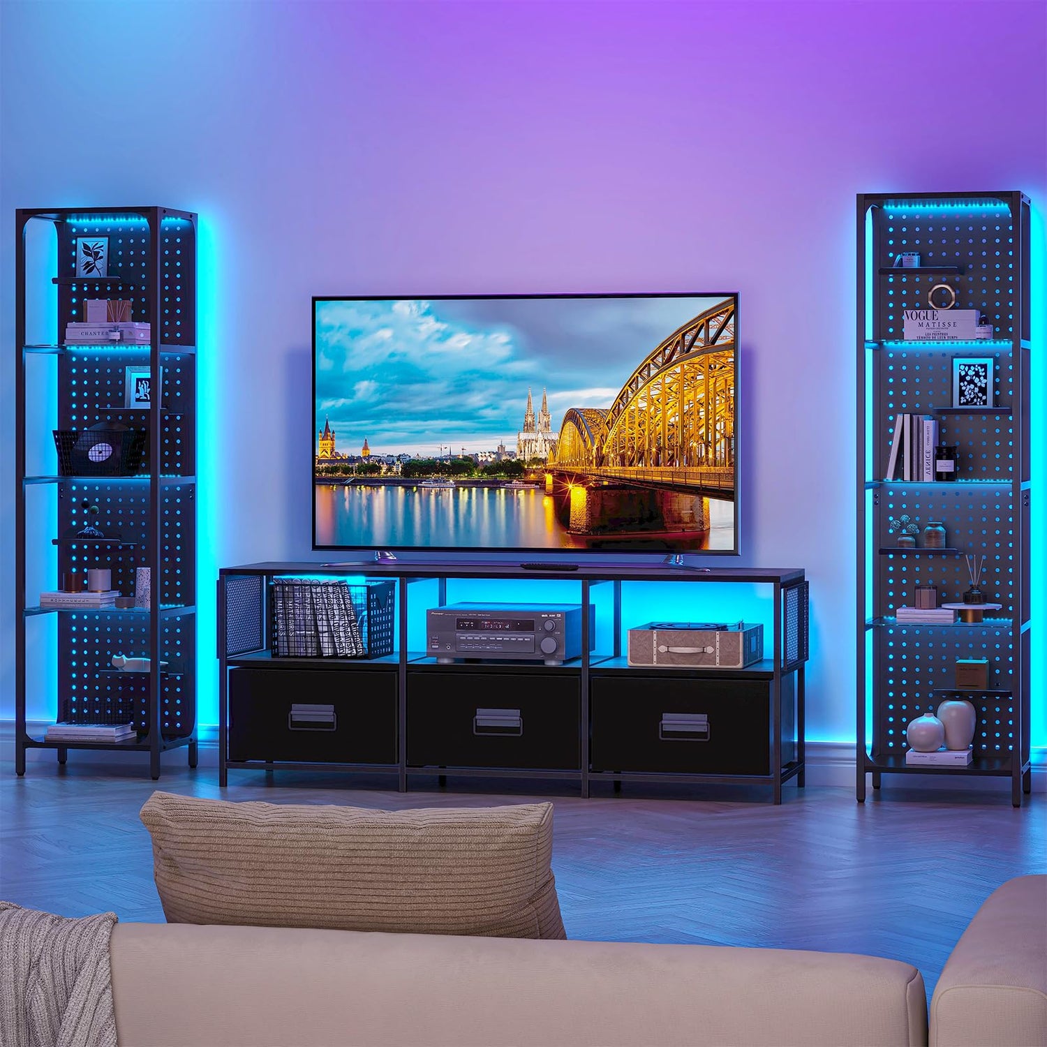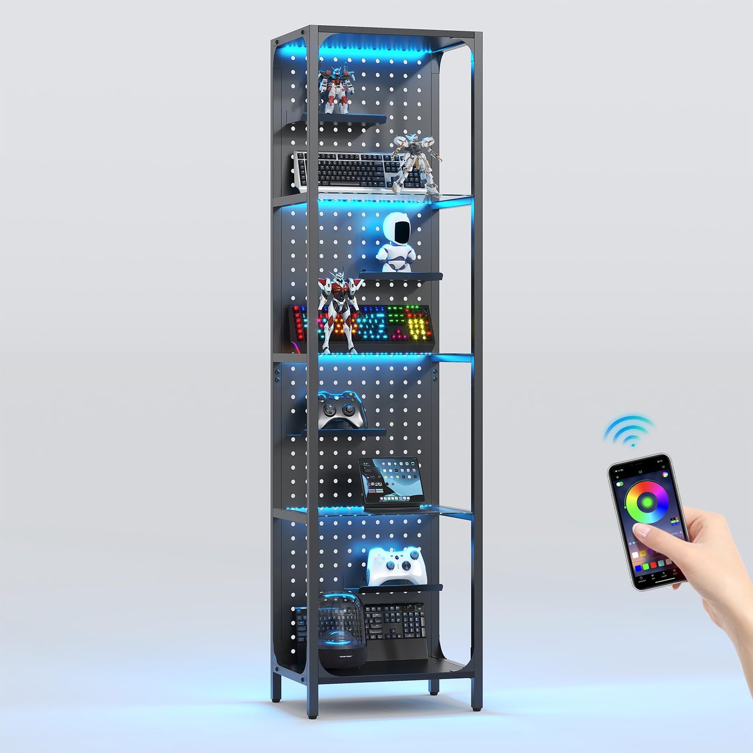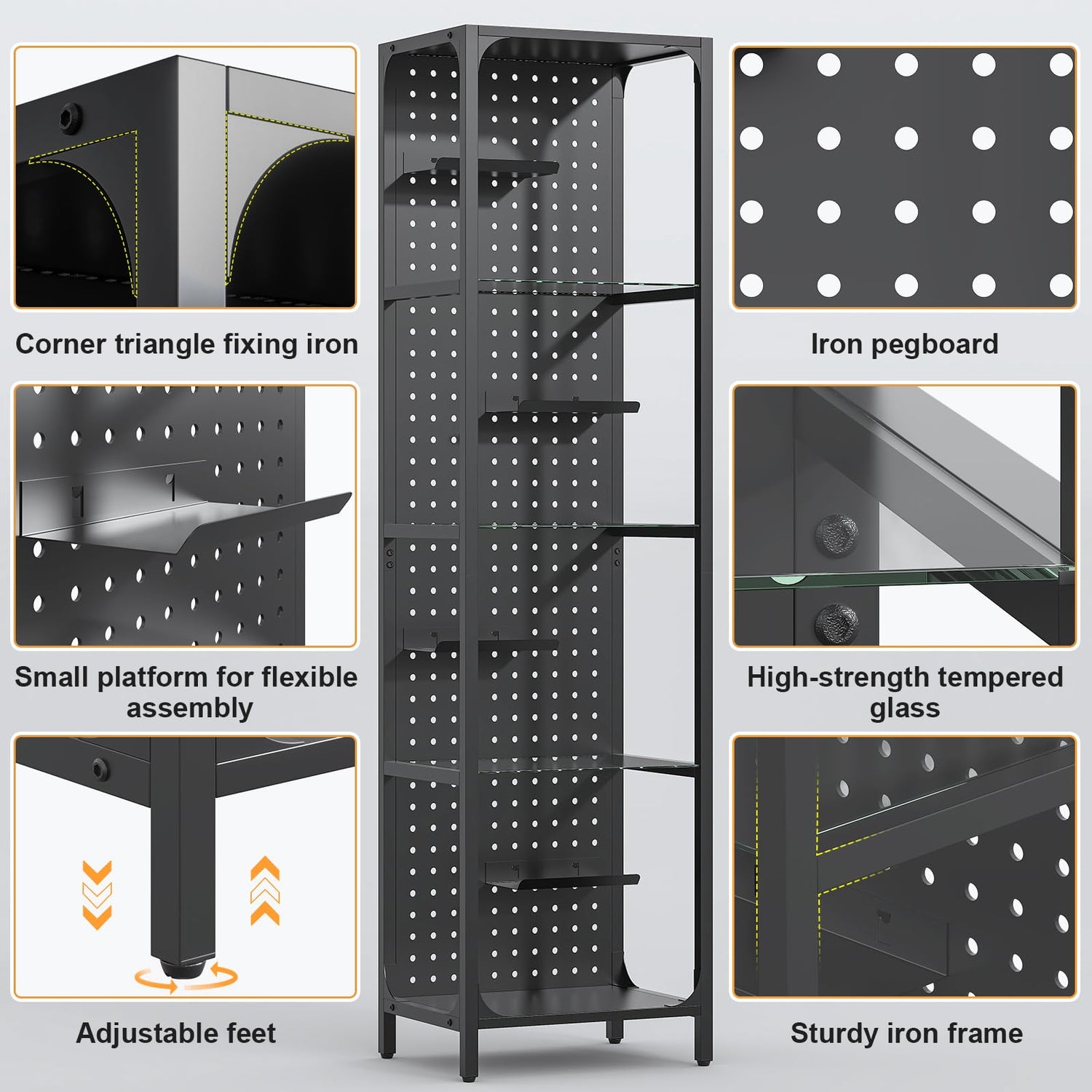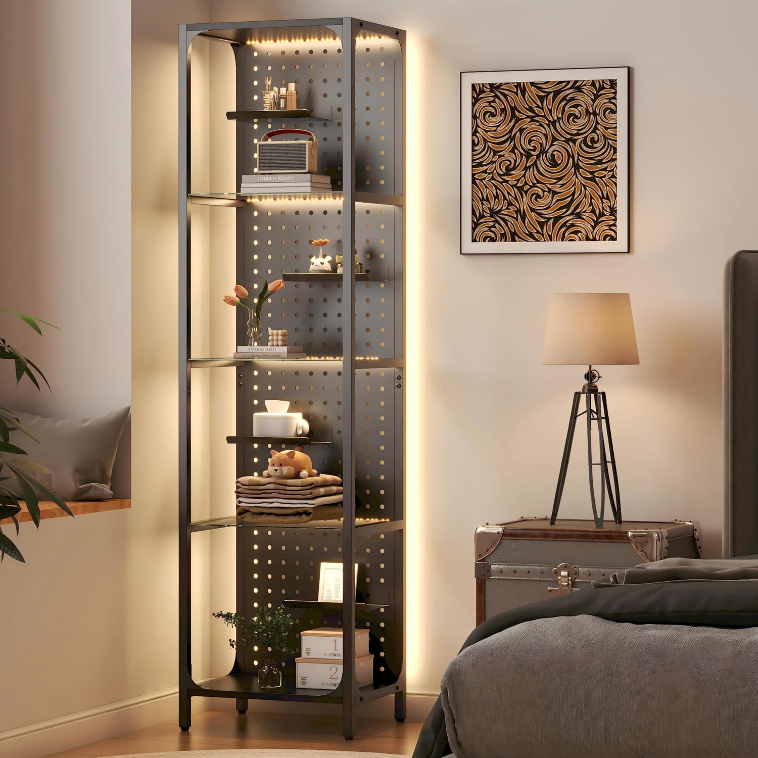 Saudism Glass Display Shelf for Collectibles, LED Black Shelf, Curio Cabinet, Lighted Tall Narrow Shelf with Pegboard Steel Frame for Gaming Room, Floor Lamp with Shelves, Living Room, Bedroom, Small