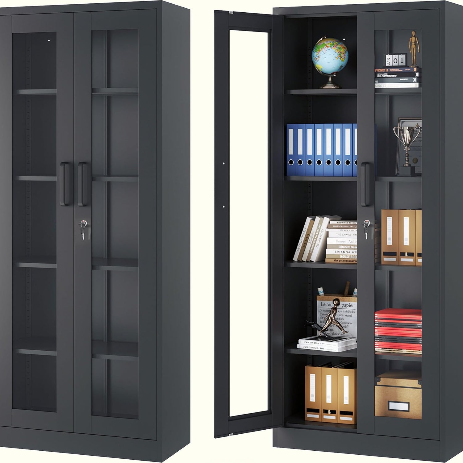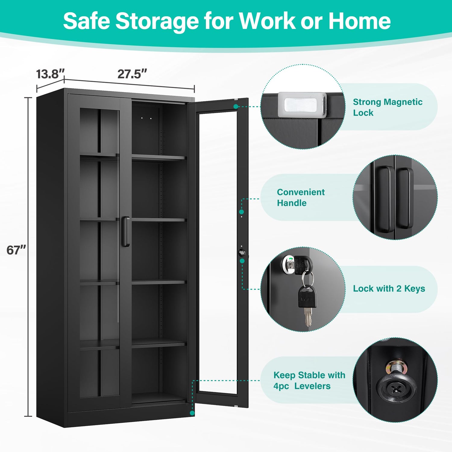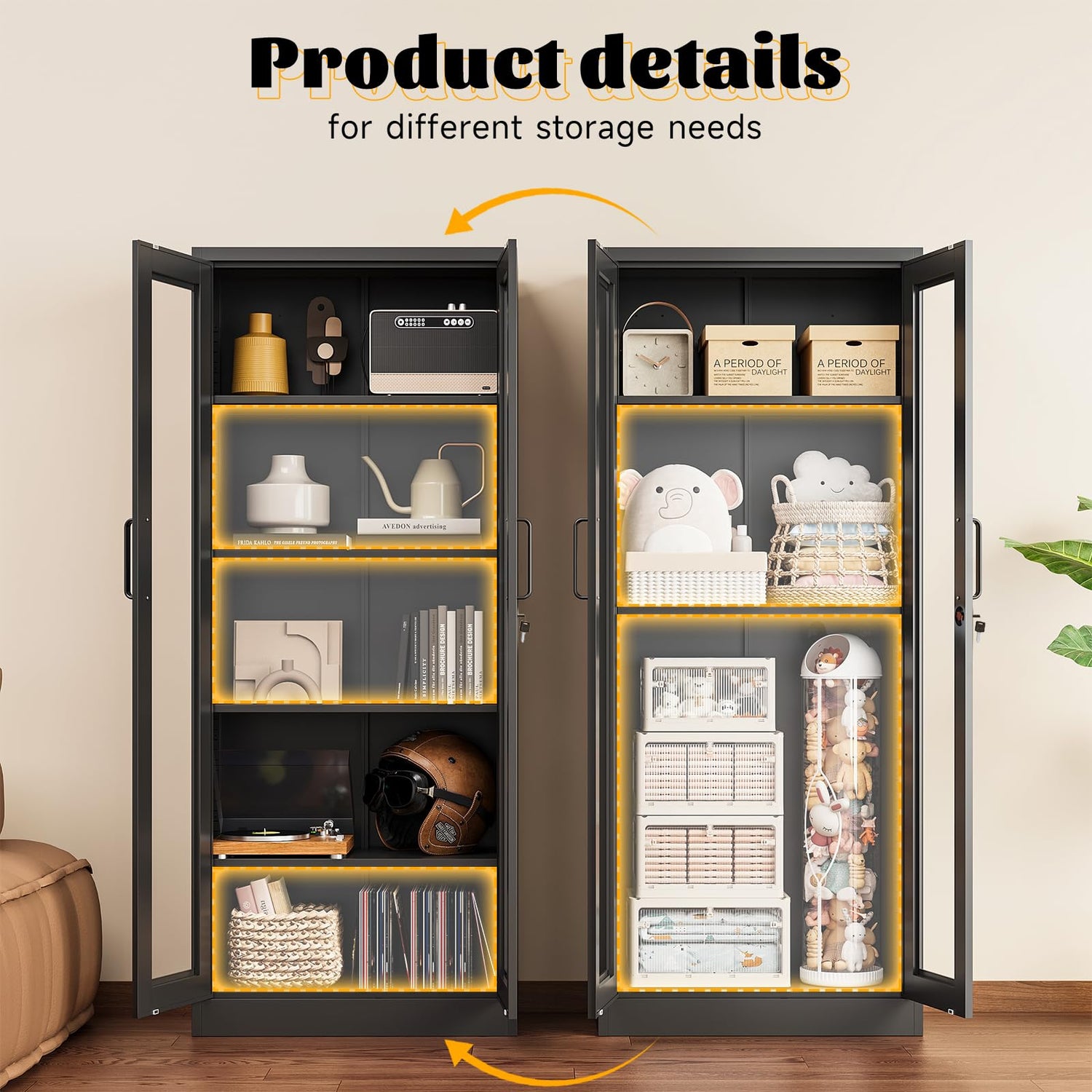 - 【Glass Door with Lock and Magnets】: Metal Display cabinet with doors and shelves have a lockable door with 2 keys and adopt a 3-point locking system, which allows you to store your valuables safely. This metal storage cabinet with doors and shelves can be used in the home, office, garage, warehouse, workshop, school, or anywhere you need additional storage.