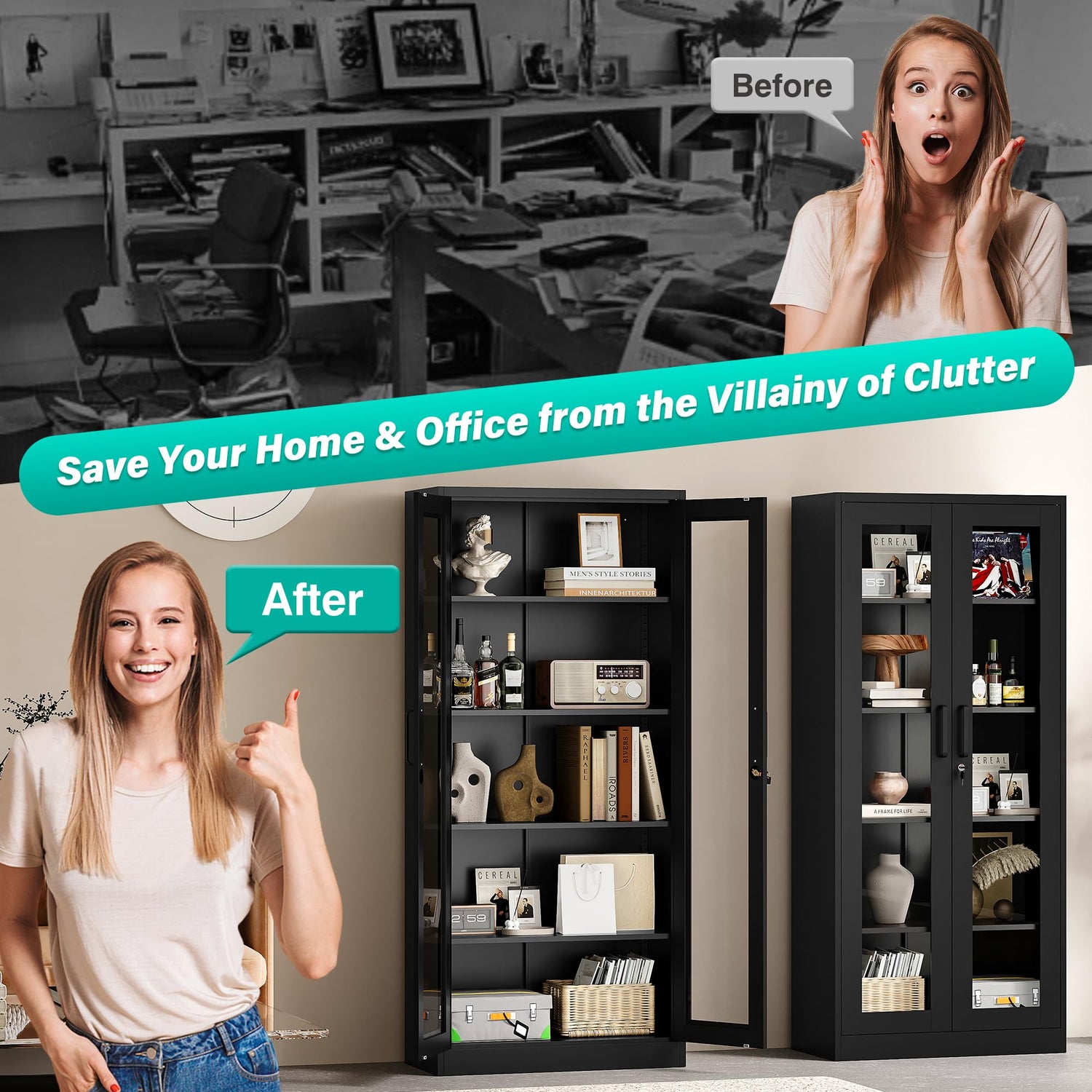 SISESOL Metal Storage Cabinet with Lock and Glass Doors,Glass Display Cabinet,67" Tall Black Storage Cabinets,Locking Curio Cabinets with 5 Shelves for Collectibles,Home,Office,Living Room