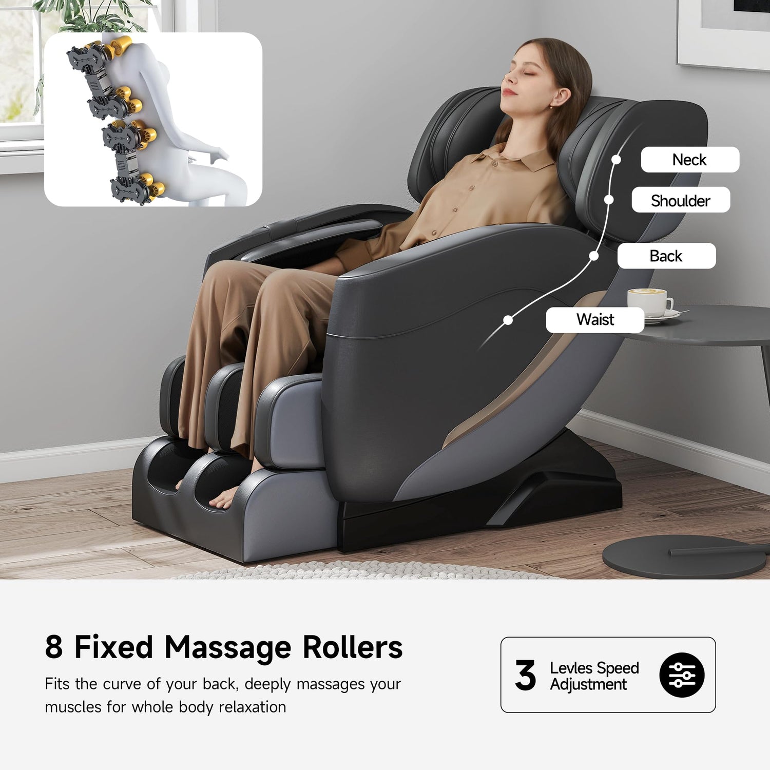 - [Back Massage] This massage chair full body has 8 fixed rollers fits the curves of your body, cover your entire back, simulate shiatsu kneading massage, relax your whole body.
