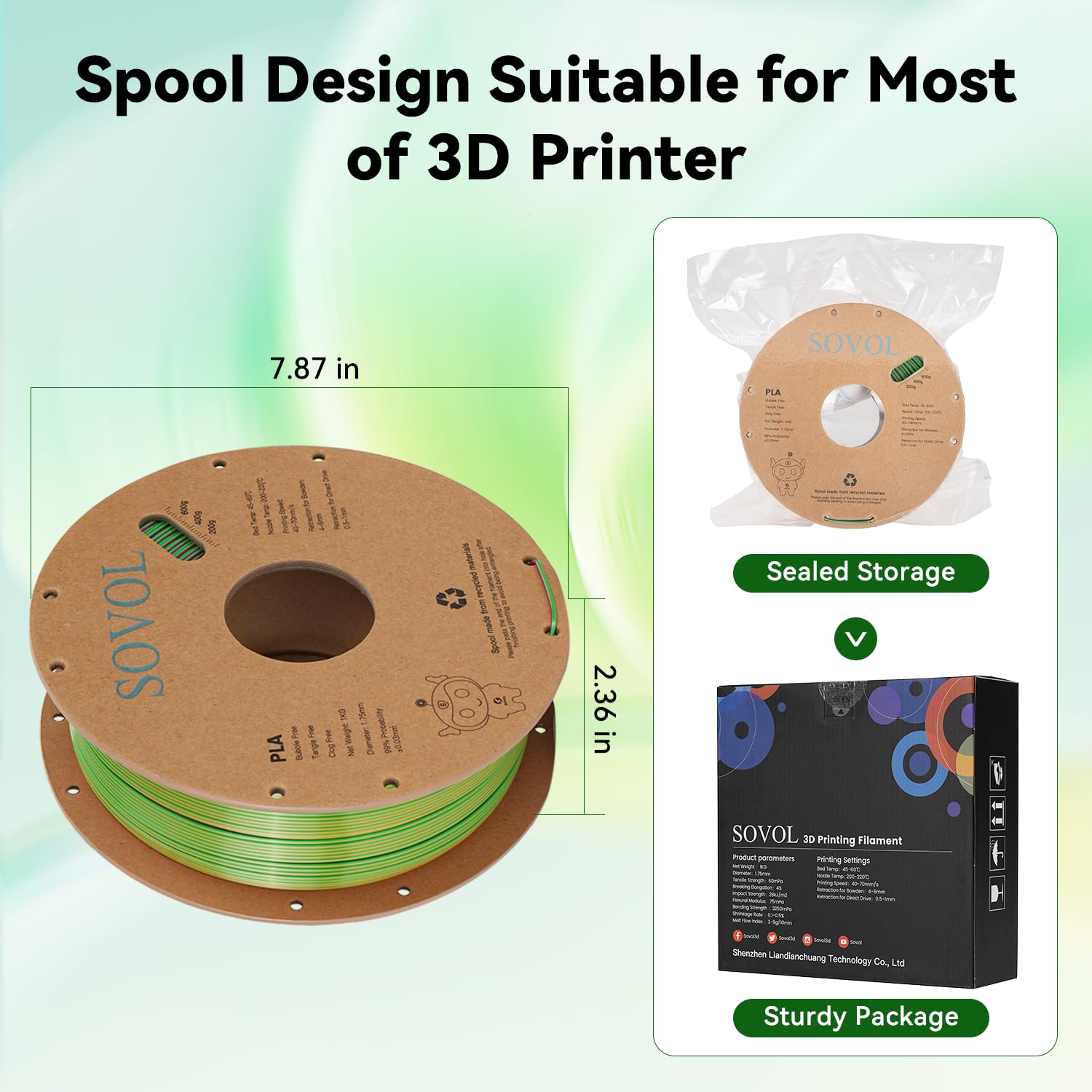 - 【Tri-Color Co-extruded Filament】Different from normal color change rainbow PLA filament, every inch of Sovol magic 3d filament is made of three colors-Gold, Green and Rose Red. You will easily get all 3 colors, even for very small prints. You can change the visible color by rotating the color-blending filament to different orientations. Multicolor silk filaments can output with incredible pearlescent and gorgeous shiny surface.