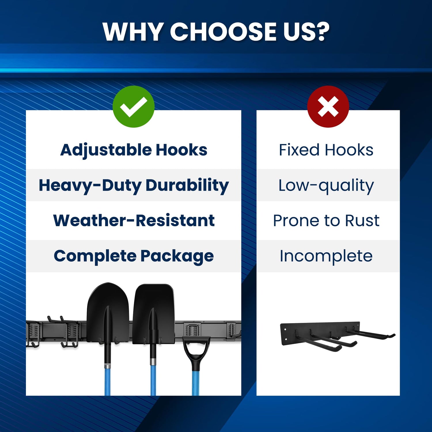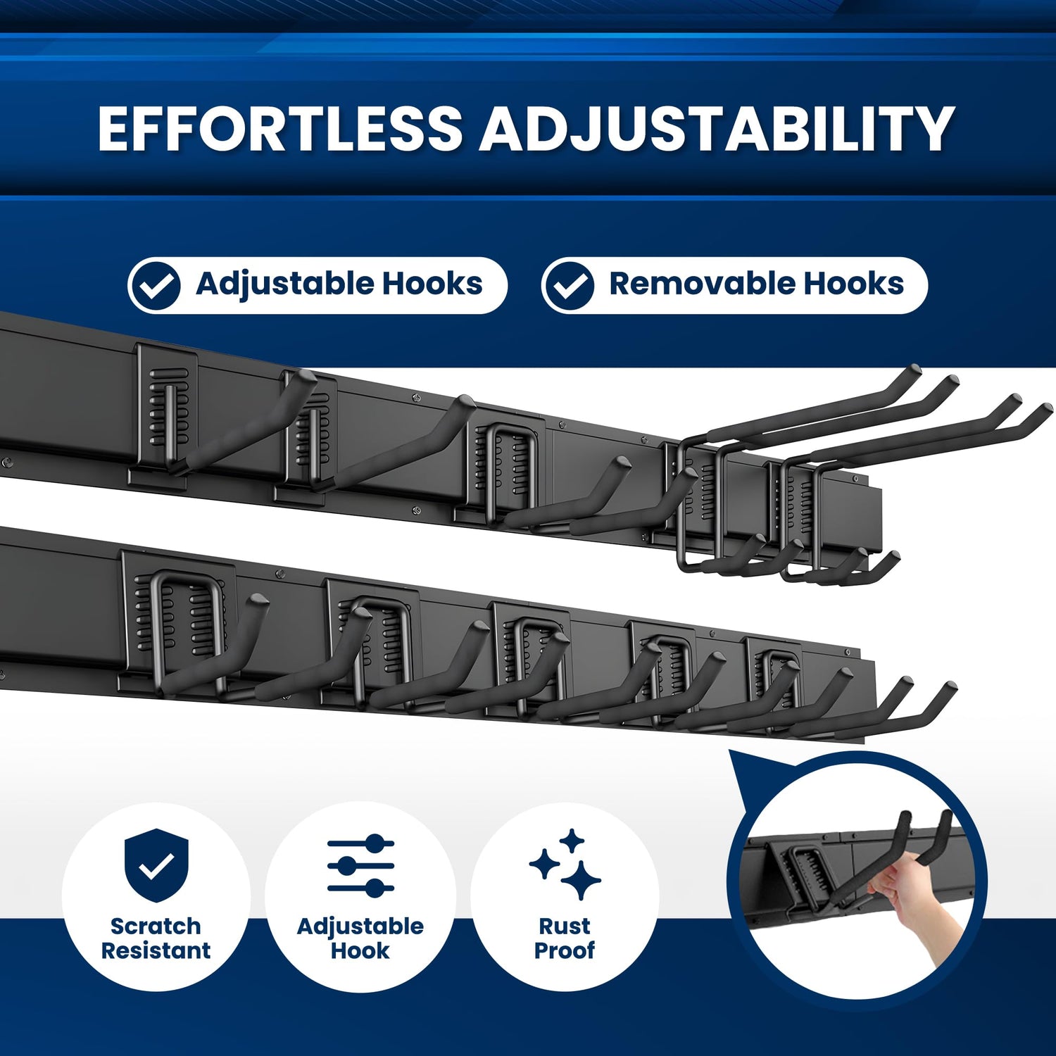 - Customizable Tool Organizer: Featuring 10 adjustable hooks—Equipped with 10 hooks(6 tool hooks, 2 double-layer hooks, 2 single hooks) and 4 rails, this garden tool organizer allows you to tailor your setup to meet your specific needs.