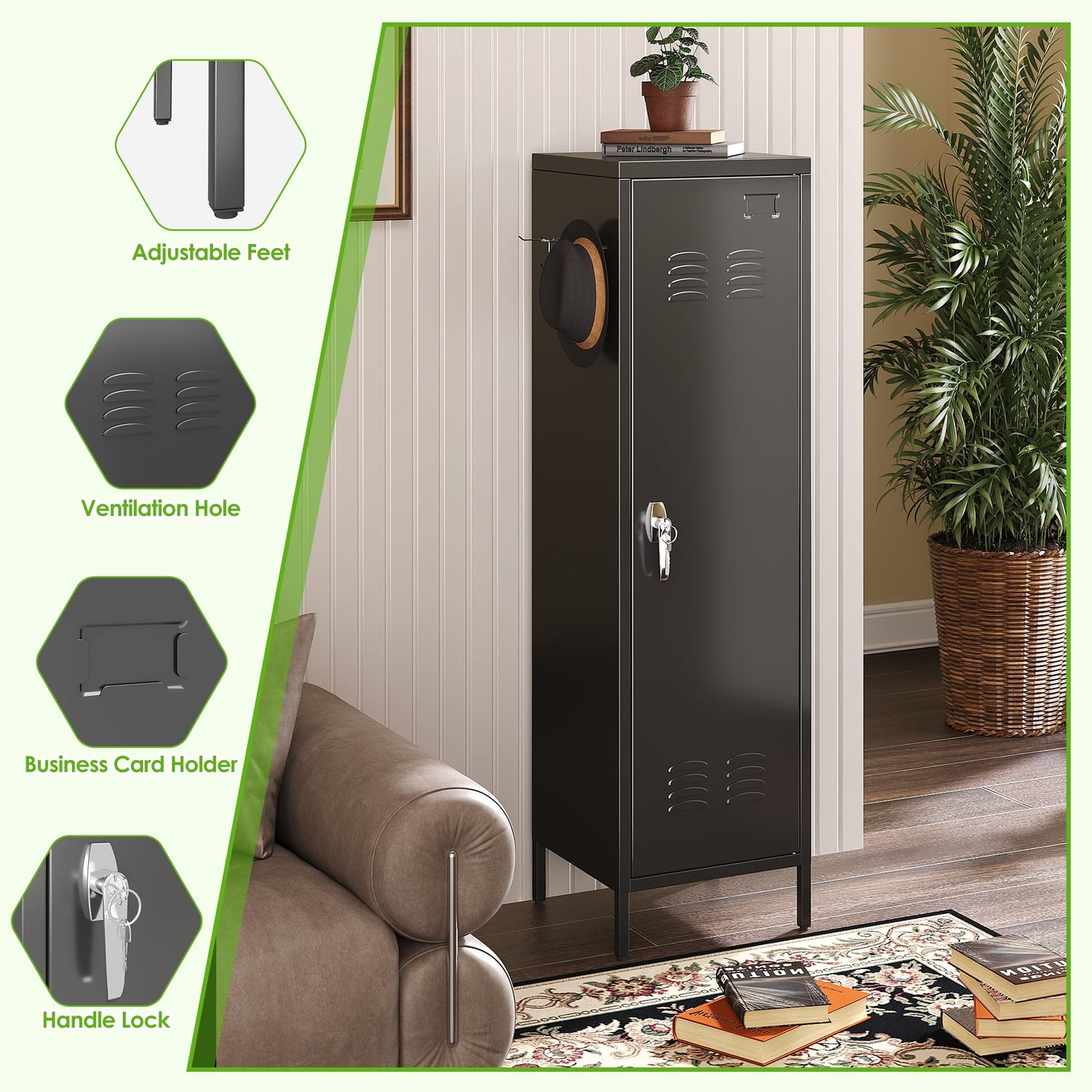 SUPEER 1 Door Metal Storage Lockers with Handle and Hanging Rod,Metal Locker for Employees with Pegboard and Hooks for Home,Office,Gym, School, Garage,Assembly Required,Black
