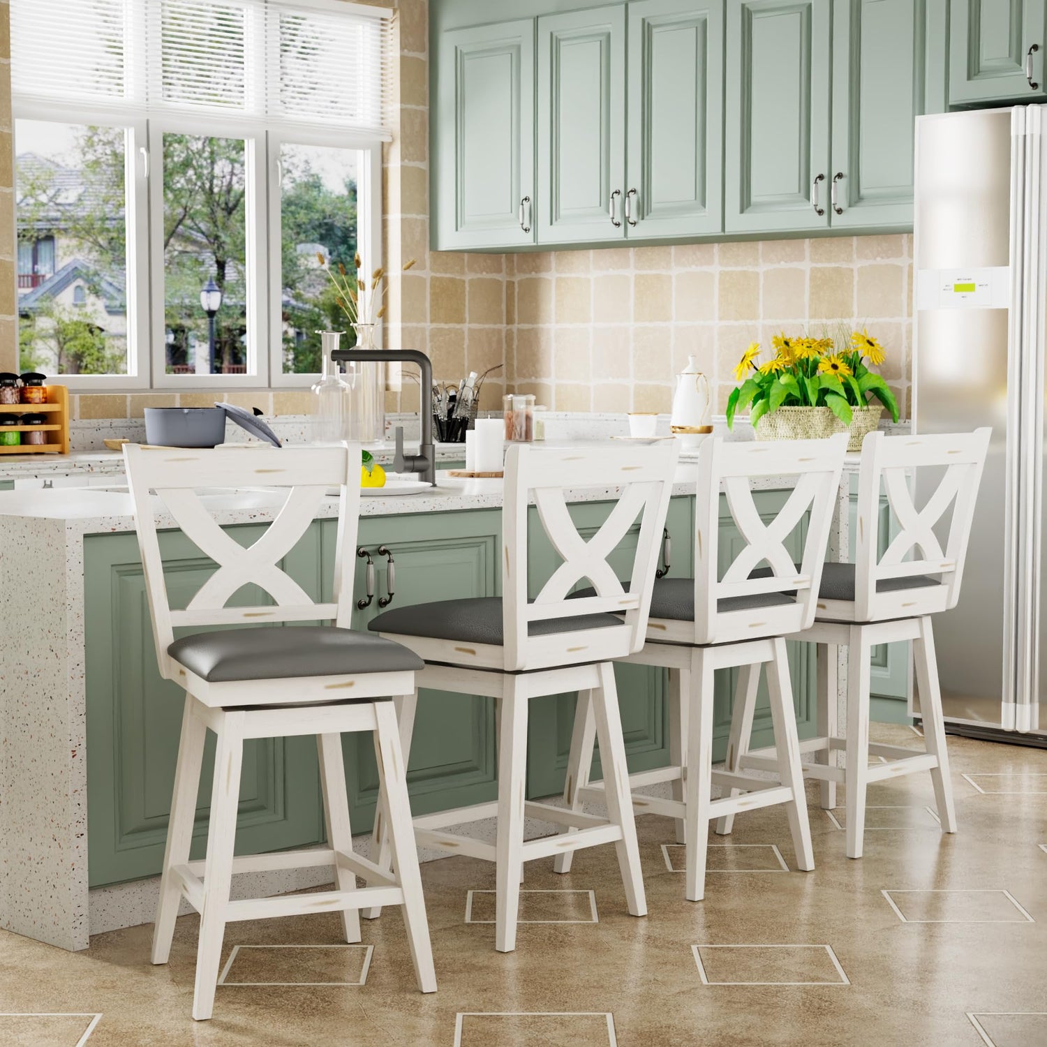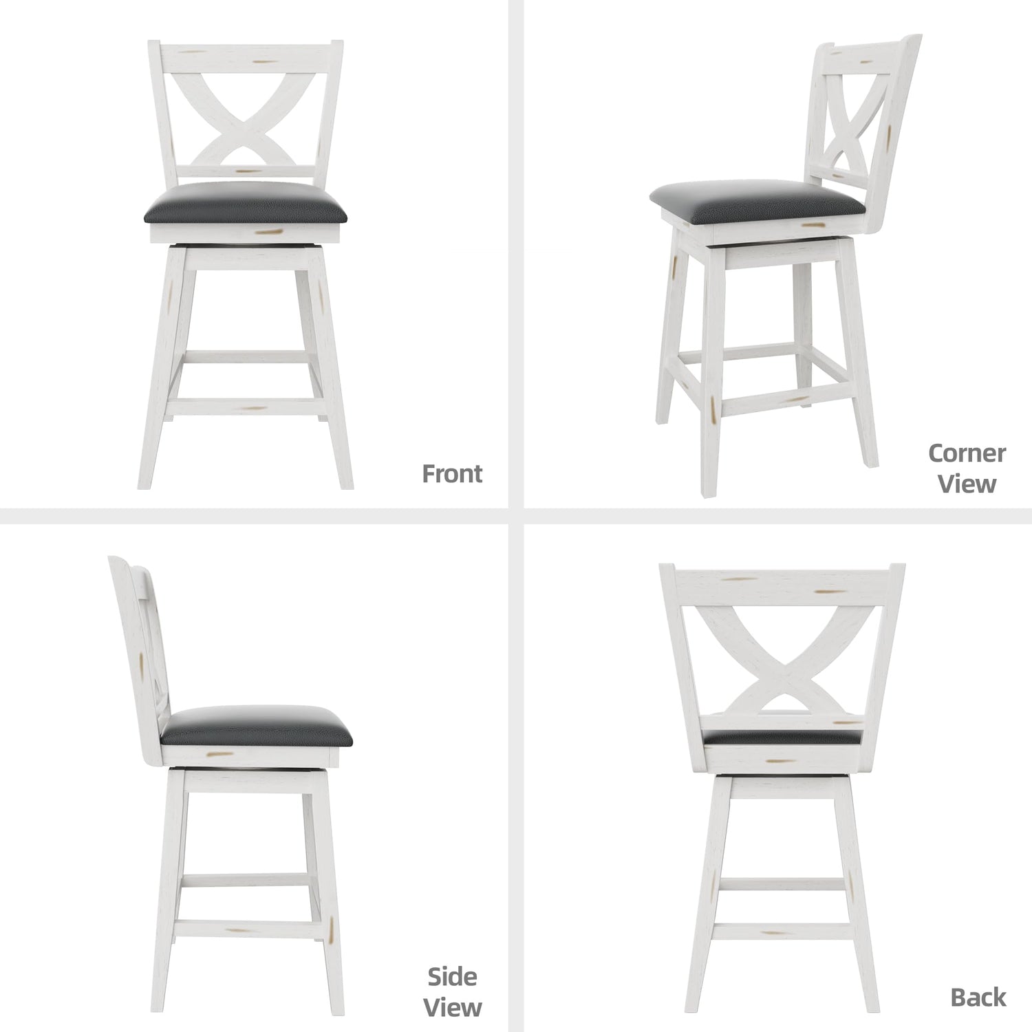 Swivel Bar Stools Set of 2, Swivel Barstools with Solid Footrest & Faux Leather Upholstered Seat, Island Chairs with Back for Kitchen, Dining Room (Antique White) (24-inch)