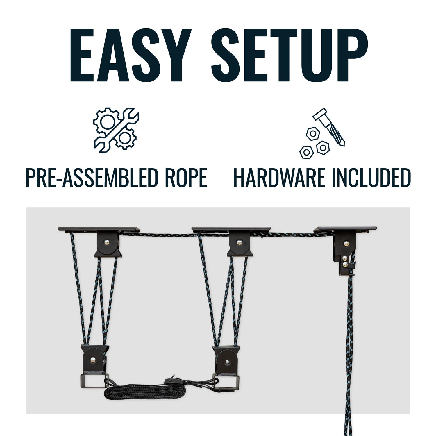 Details: The Heavy-Duty Canoe Hoist provides secure, overhead storage for your canoe, freeing up valuable floor space while keeping your gear within easy reach. Featuring a 4:1 mechanical advantage, this pulley system makes lifting heavy items a breeze, supporting up to 150 lbs. Whether you're hoisting a canoe or other large gear, the system does 75% of the work, allowing for effortless raising and lowering. Pre-assembled for your convenience, the hoist simplifies installation by eliminating complex rope setups. Built with premium materials like solid steel ceiling brackets and a durable woven rope, this hoist ensures safe and reliable overhead storage. The flush-mount design reduces ceiling clearance to as little as 6.25", optimizing your space by keeping bulky items out of the way. Designed to work with both parallel and perpendicular ceiling joists, this versatile hoist is ideal for garages, boathouses, or any storage space needing a secure solution for heavy equipment.