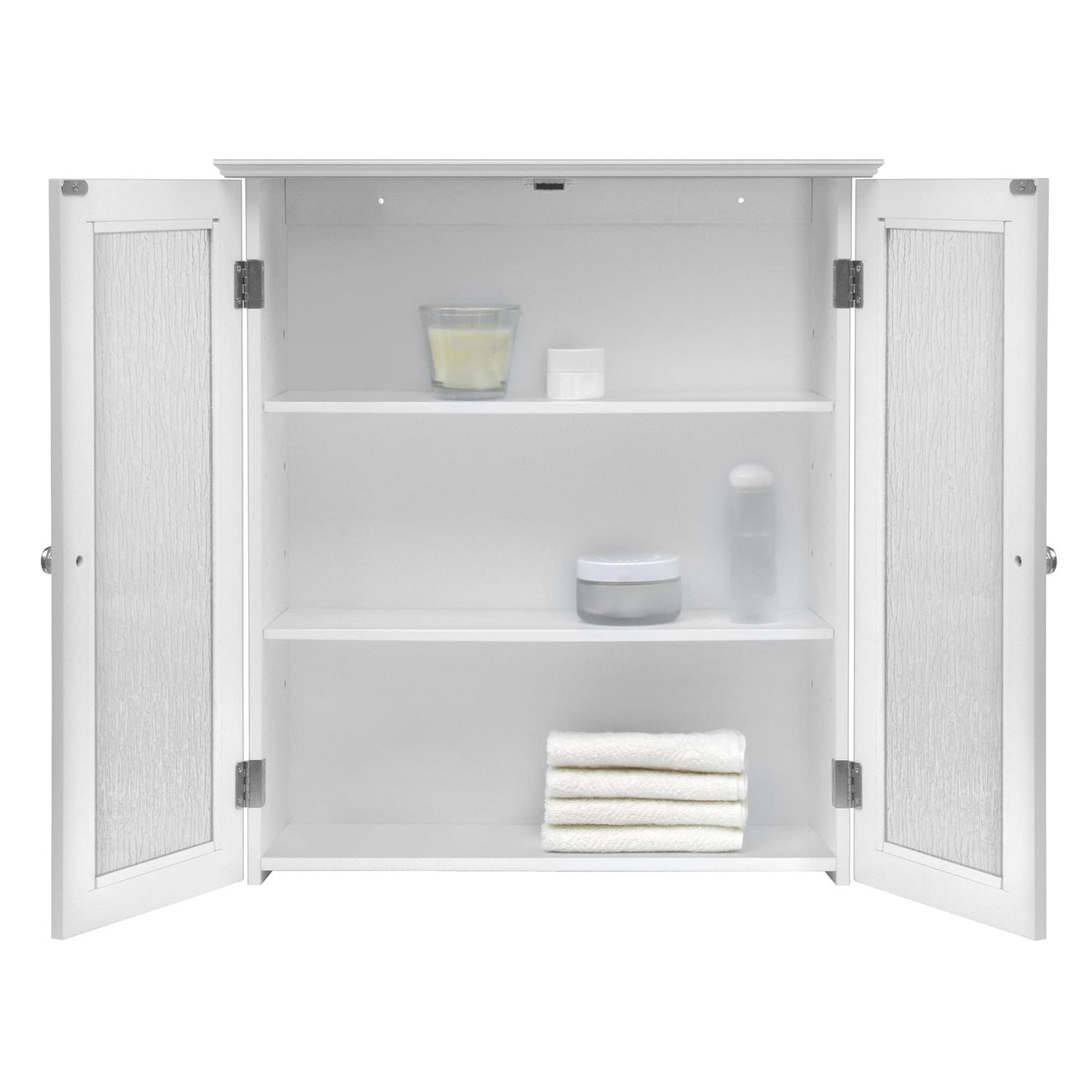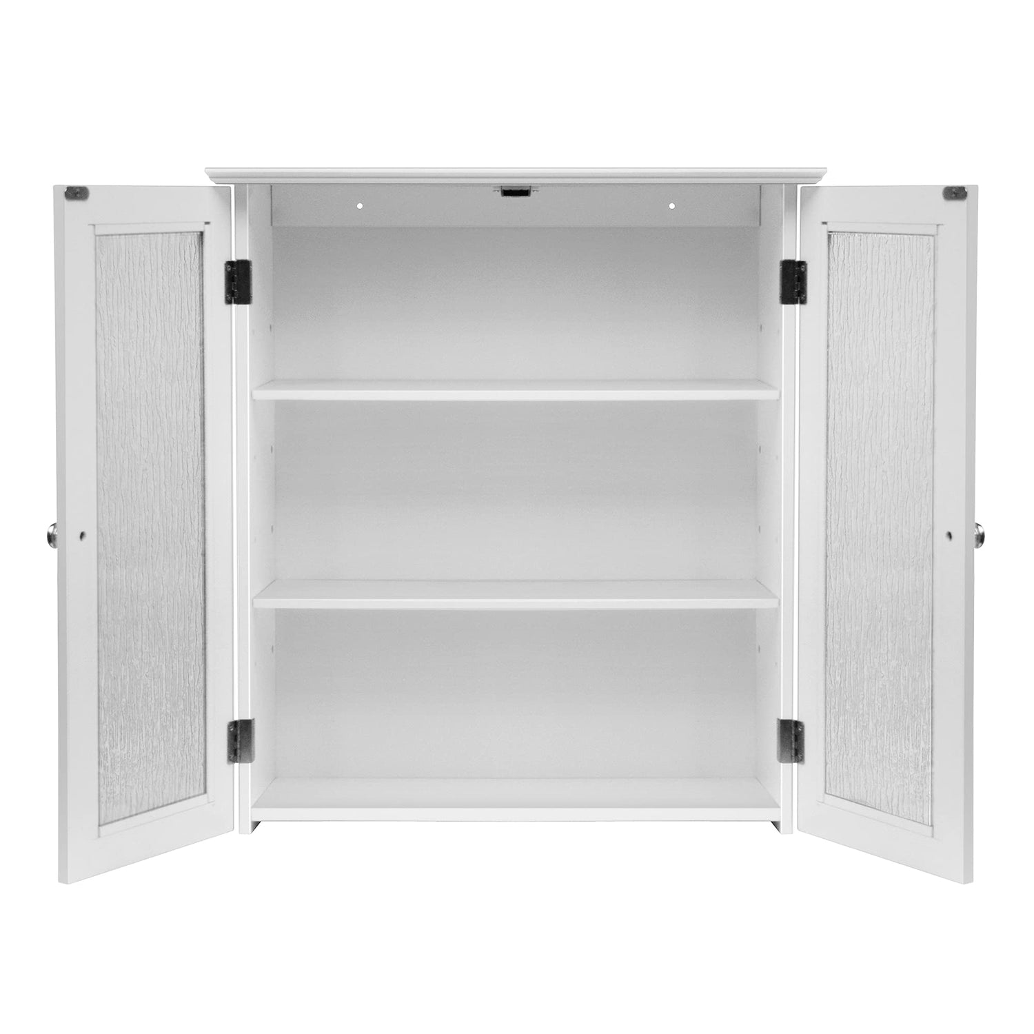 Details: The Dixie Wall Cabinet from Elegant Home Fashions features two water textured glass panel doors in a white finish. The cabinet's classic design offers ample storage. The cabinet features three fixed shelves that are ideal for storing items. The double plated door knobs add a charming touch. This cabinet comes with assembly hardware.