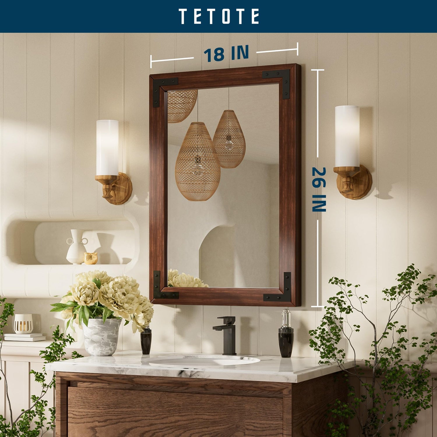 TETOTE 18 x 26 Walnut Wood Mirror for Bathroom Wall/Bedroom/Living Room/Entryway Farmhouse Rustic Bathroom Vanity Mirror for Over Sink Waterproof (Horizontal/Vertical Mounted)