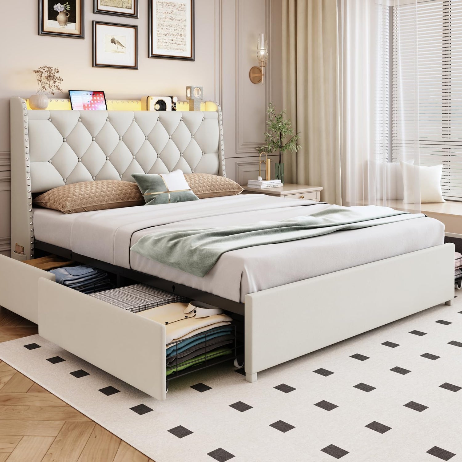 TIGUBFRE Full Size Bed Frame with 4 Drawers and Storage Headboard, Upholstered Tufted Wingback Bed Frame with LED Lights and Charging Station, No Box Spring Needed, Easy Assembly, Noise Free, Beige