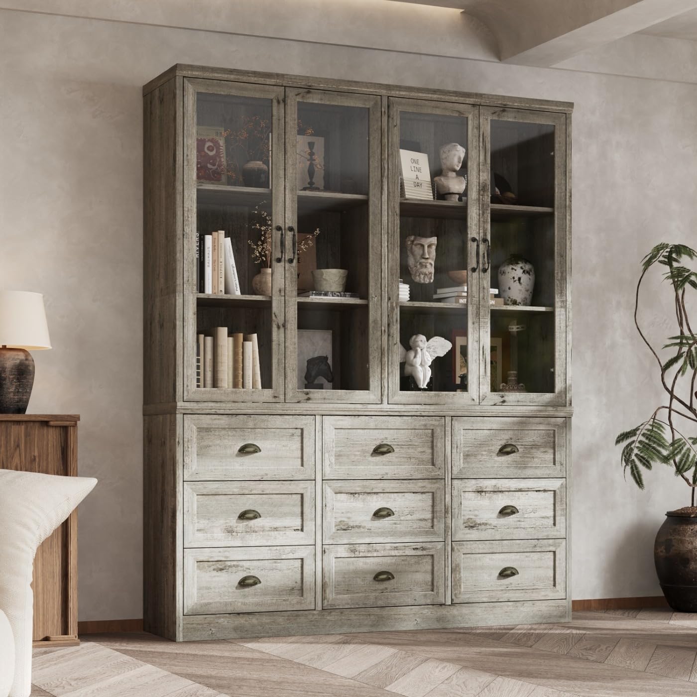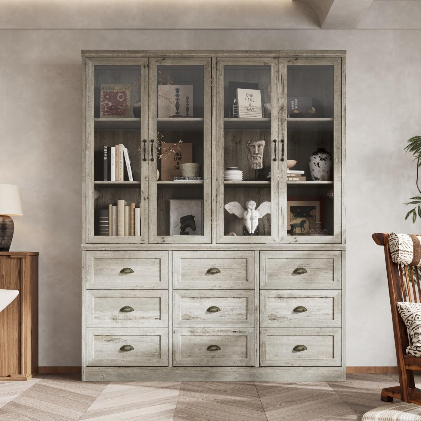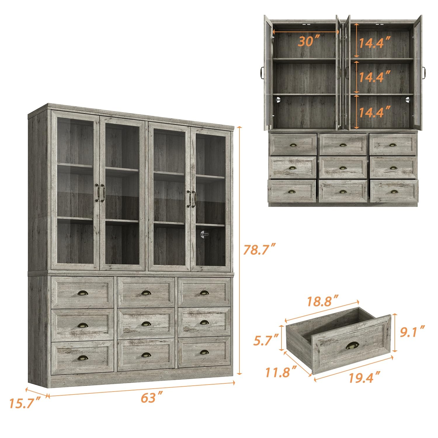 - Spacious Storage and Display Space: This glass storage cabinet has a large storage and display space, with overall dimensions of 78.7 x 63 x 15.7 inches, the top cabinet has 4 glass doors, shelves partitioned into 3 spacious compartments, and the bottom is equipped with 9 equal-depth drawers, which can be categorized to store a wide range of items, such as books, cutlery, documents, etc., to meet the diversified storage needs of the home and the workplace.