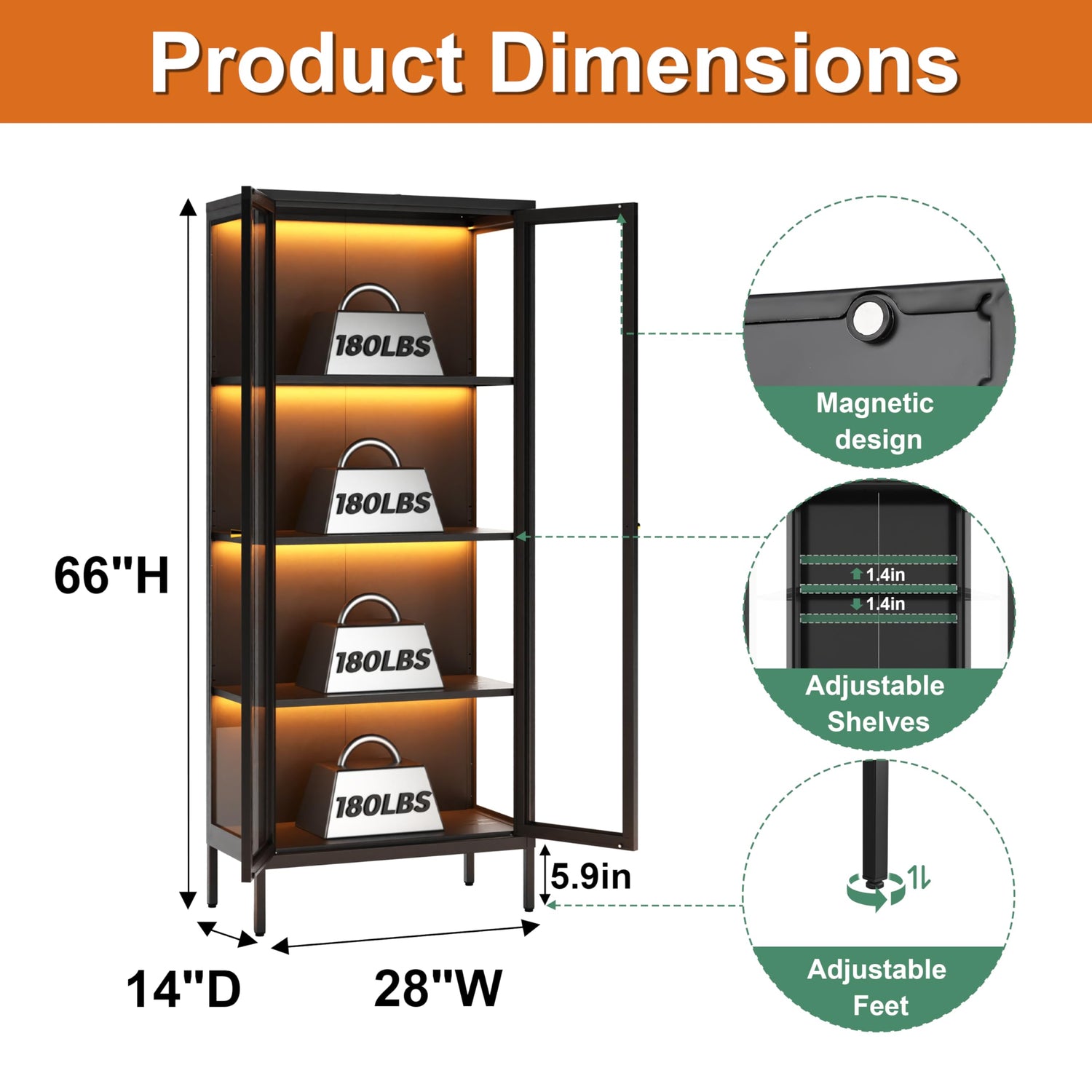 - HUMANIZED DESIGN: This curio display cabinet is equipped with a magnetic suction device toimprove the stabilityof closing the door, With 4 adjustable feet, you can adjust thefeet to ensure the stability of the curio cabinet, The back of the cabinet has ananti-tipping device to protect your safety