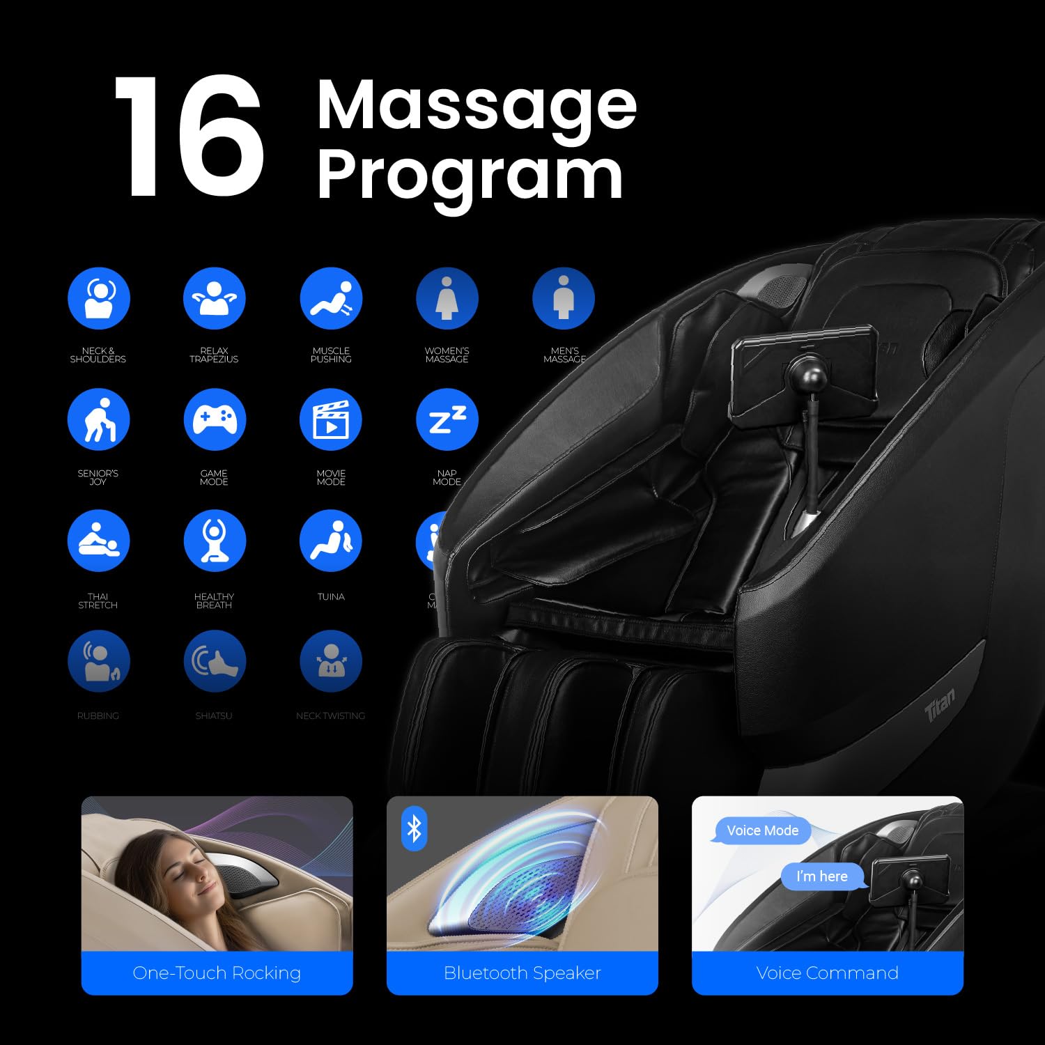 Titan Axiom LE l Dual Massage Mechanism l Full Body Massage Chair l Intelligent Voice Control l 45°C Heating Therapy l Zero Gravity Reclining l Space Saving l Bluetooth Speakers (Black)