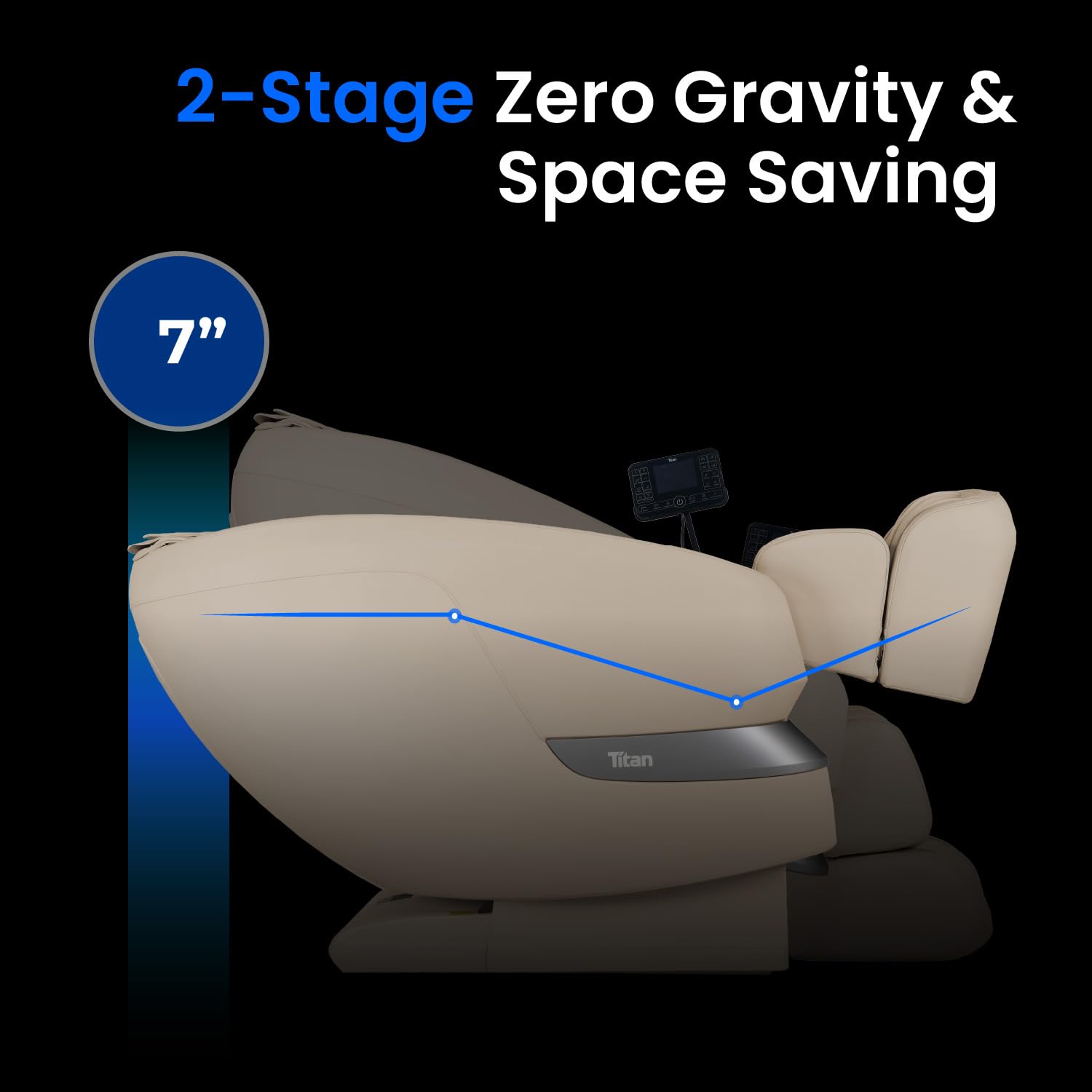 - 2-STAGE ZERO GRAVITY & SPACE-SAVING TECHNOLOGY: Originally pioneered by NASA, the Titan Axiom LE uses Two-Stage Zero Gravity to allow the user to rest in a state of complete weightlessness for the ultimate massage experience. Using Space-Saving Technology, the Axiom LE can be placed 7 inches away from the wall and still achieve a complete recline.