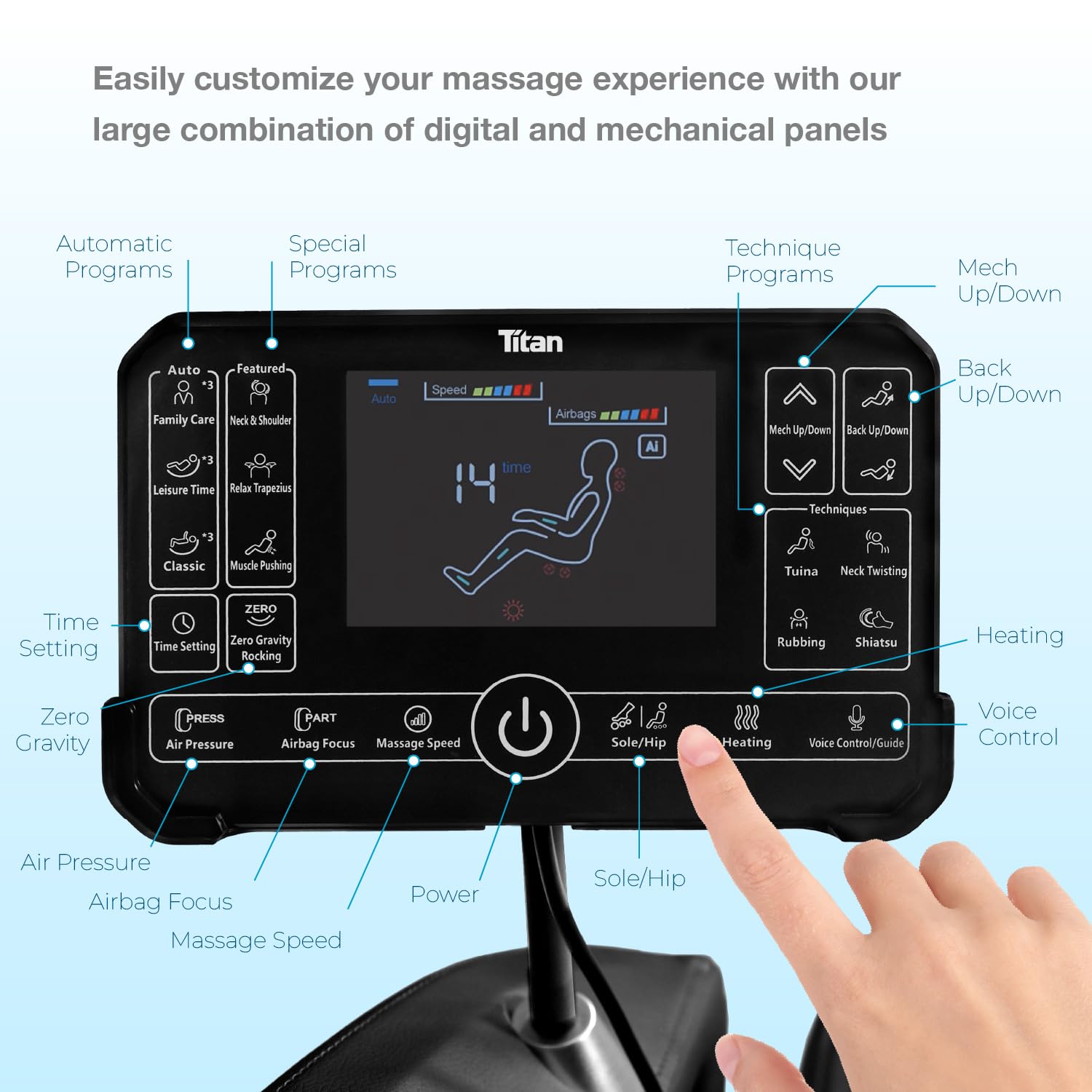 - 24-CELL FULL BODY AIR MASSAGE: The Titan Axiom LE features 24 air cells across the shoulders, arms, legs, and feet for a full body massage. With 5 levels of air intensity and a dual-disc foot massage combined with airbags, it boosts circulation and delivers a deeply revitalizing experience.