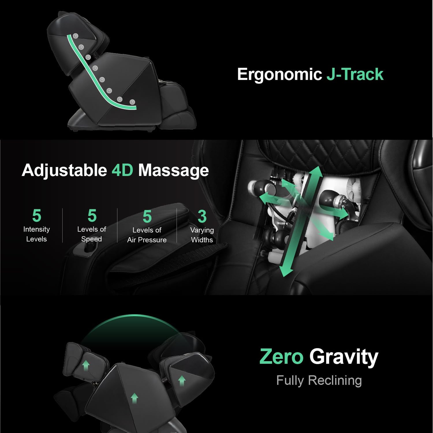 - 4D Massage: The Soho II offers a highly customizable massage, with five degrees of speed, three varying widths, five levels of massage intensity, and five distinct air pressure intensities. The 4D massage heads move, vertically, horizontally, in and out and rotates at variable speeds. This chair offers one of the most life-like massages in the market.