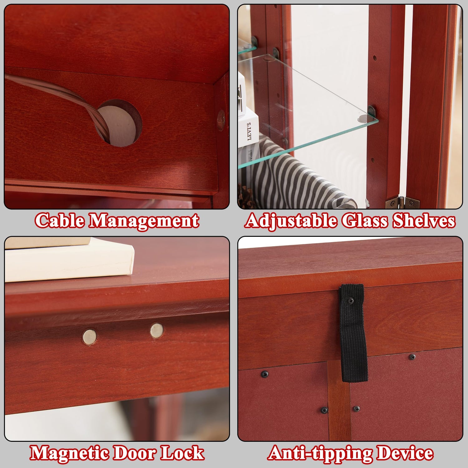 - 【Safety Devices & Aesthetic Details】This glass curio display case has an anti-tipping device on the back. Securely fasten the glass cabinet to the wall to ensure the safety of you and your family. This lighted glass cabinet can be fitted with light bulbs to illuminate display items (1 x 120V 4W T-bulb included). The plug-in design continuously illuminates your collection, and the hidden cable channel on the back makes it easy to organize cluttered cables for a neat and tidy atmosphere
