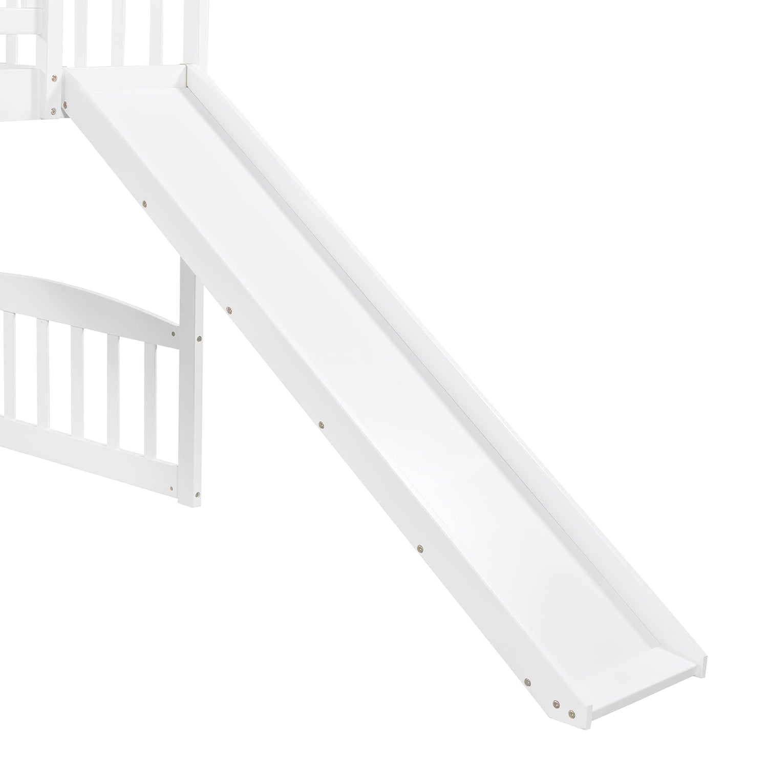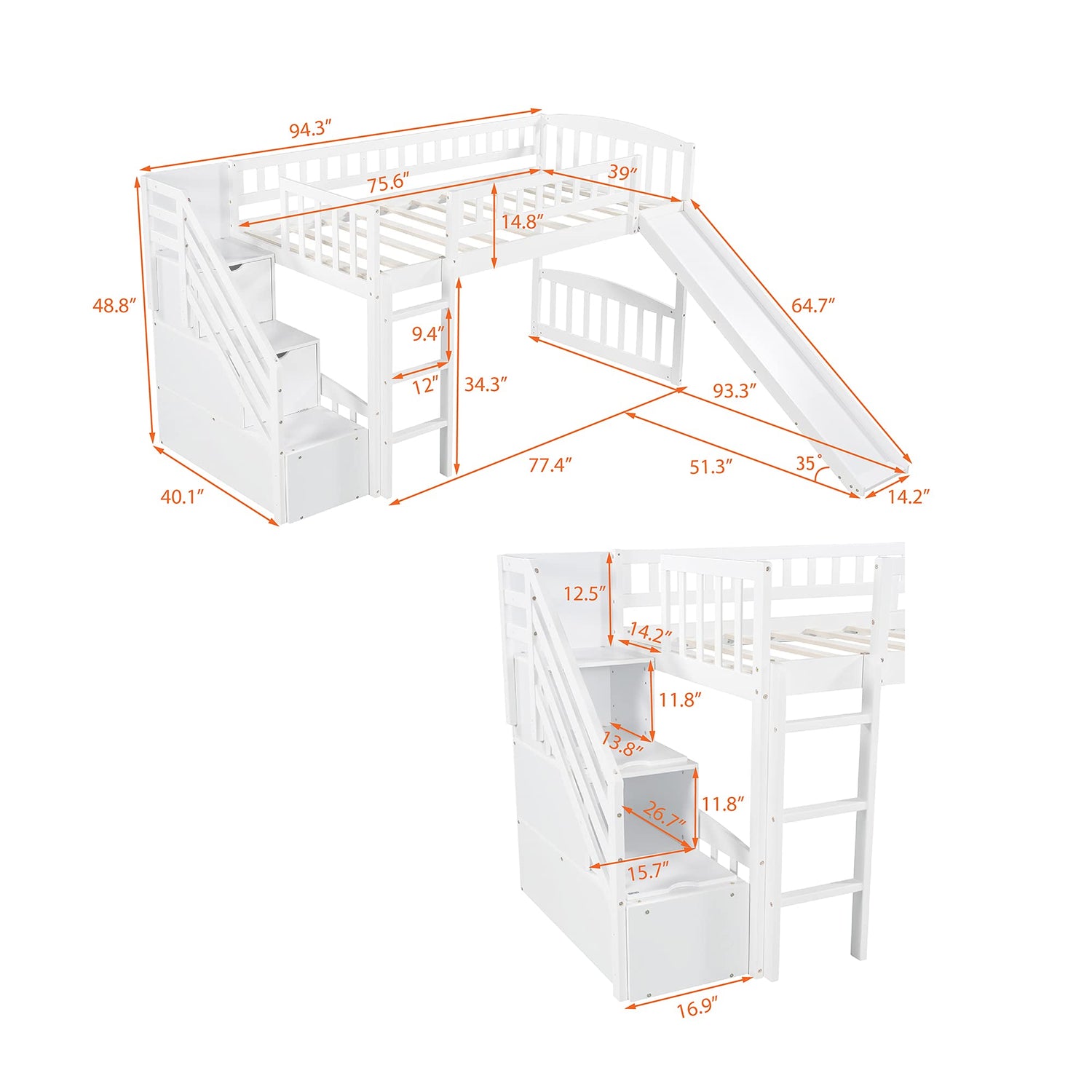 - 【Loft Bed with Slide & Stairs】 For added fun, this kids low loft bed with a unique slide, it's specially designed for children, the slide and the ladder are convertible, both of them can be put left or right. What’s more, the staircase with drawers can be put left or right. Easy access to bed with 3-step staircase. your children can go upper bed with stairs and down with slide