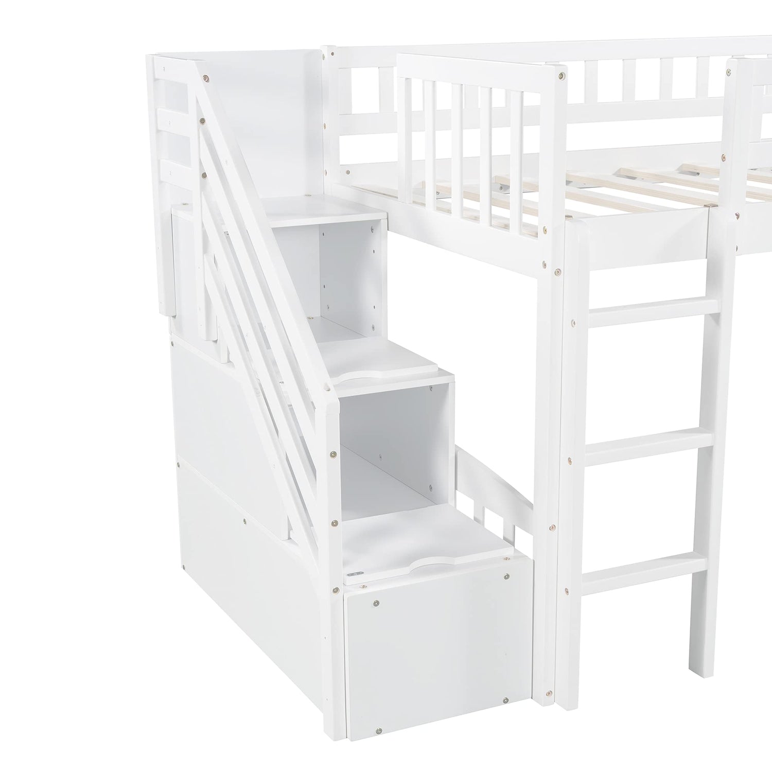 Twin Loft Bed with Slide and Stairs, Wooden Low Loft Bed Frame with Storage for Kids Girls Boys - White