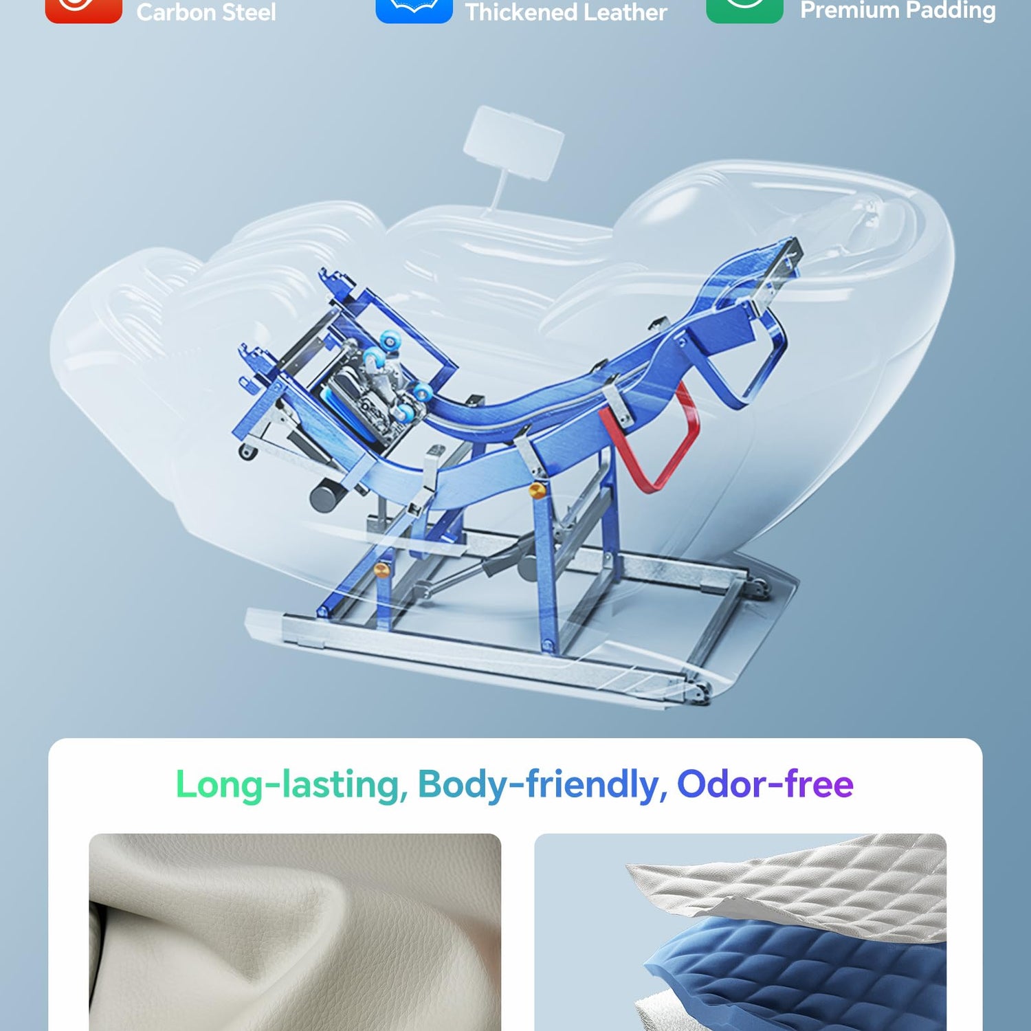 - New massage chair combines premium materials with sleek design. Featuring solid-color lychee-pattern PU leather exterior with matching LED light - a perfect fusion of technology and style. Inside, the high-tech 4D air-kneading mechanism and carbon steel frame ensure stable performance for long-lasting comfort.
