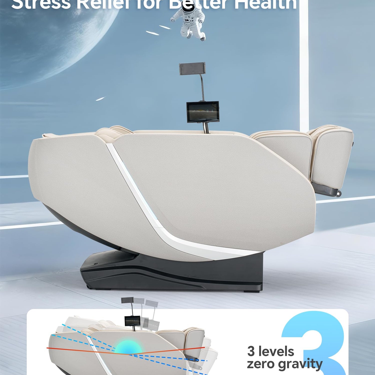 - Features classic zero gravity and stretch massage chair mode. The armrest knob allows smooth one-touch access to 3-level zero gravity positioning. The stretch mode elevates calf rests and backrest to gently extend legs and waist. These modes effectively relieve stress, reduce fatigue and restore energy.