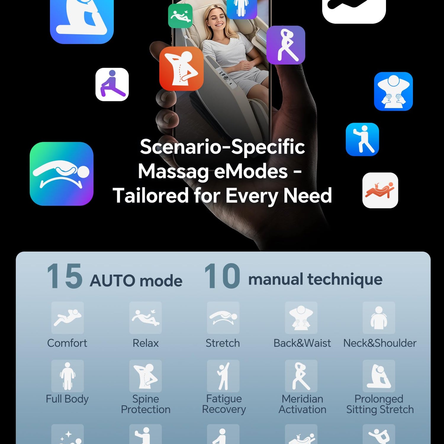 - Smart customized massage chair full body with 15 auto modes tailored to your lifestyle - sports recovery, fatigue recovery, sleep aid, prolonged sitting stretch,leisure wellness and more. Instantly find your perfect massage without complicated settings, delivering targeted relief exactly when you need it.