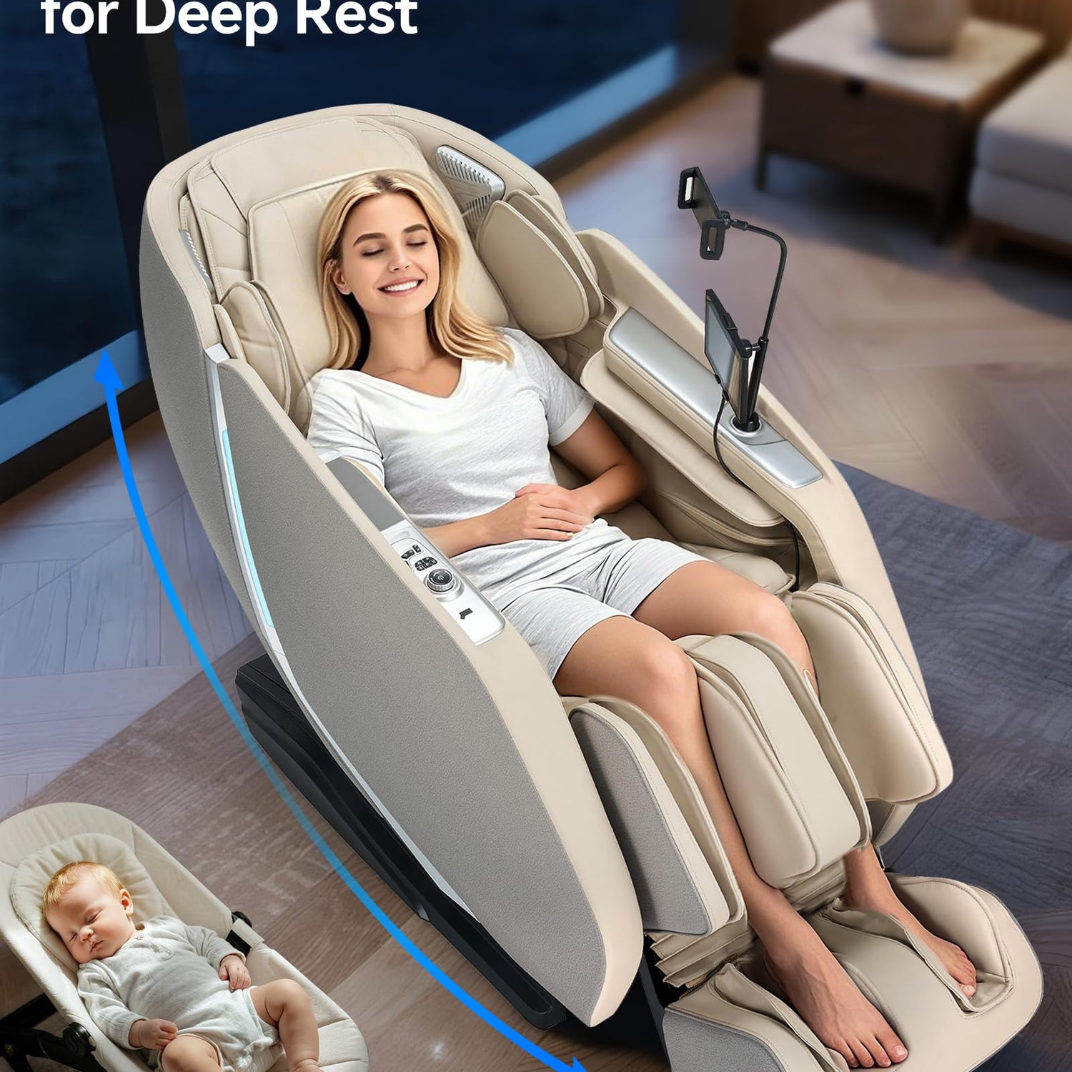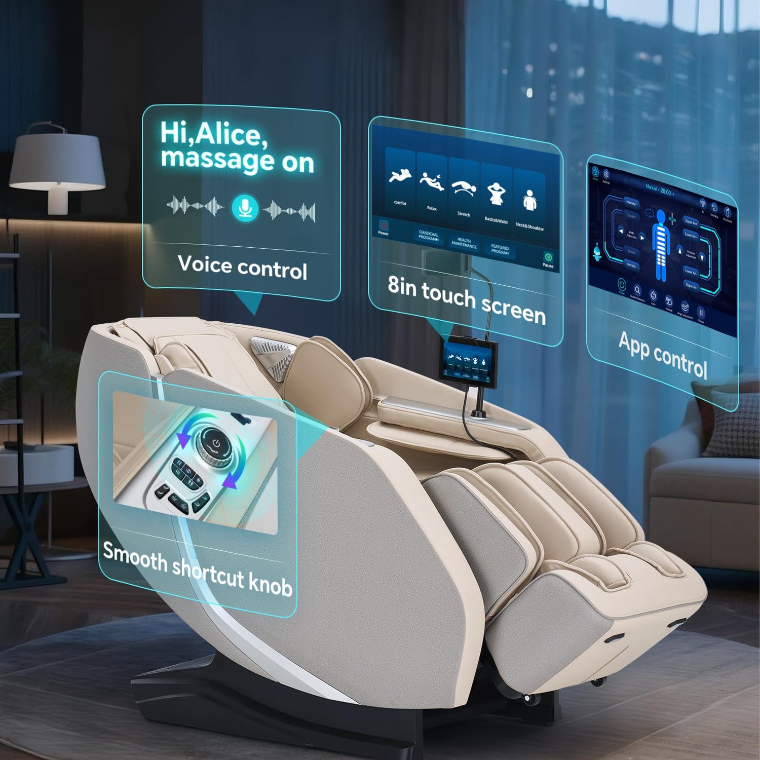 - Easy-to-use massage chair. 4 control options: App, touchscreen, voice, and armrest shortcuts. Upgraded animated touchscreen makes operation intuitive. For added convenience, it includes a phone holder, letting you comfortably use your phone during massage. Enjoy effortless control and a truly relaxing experience.