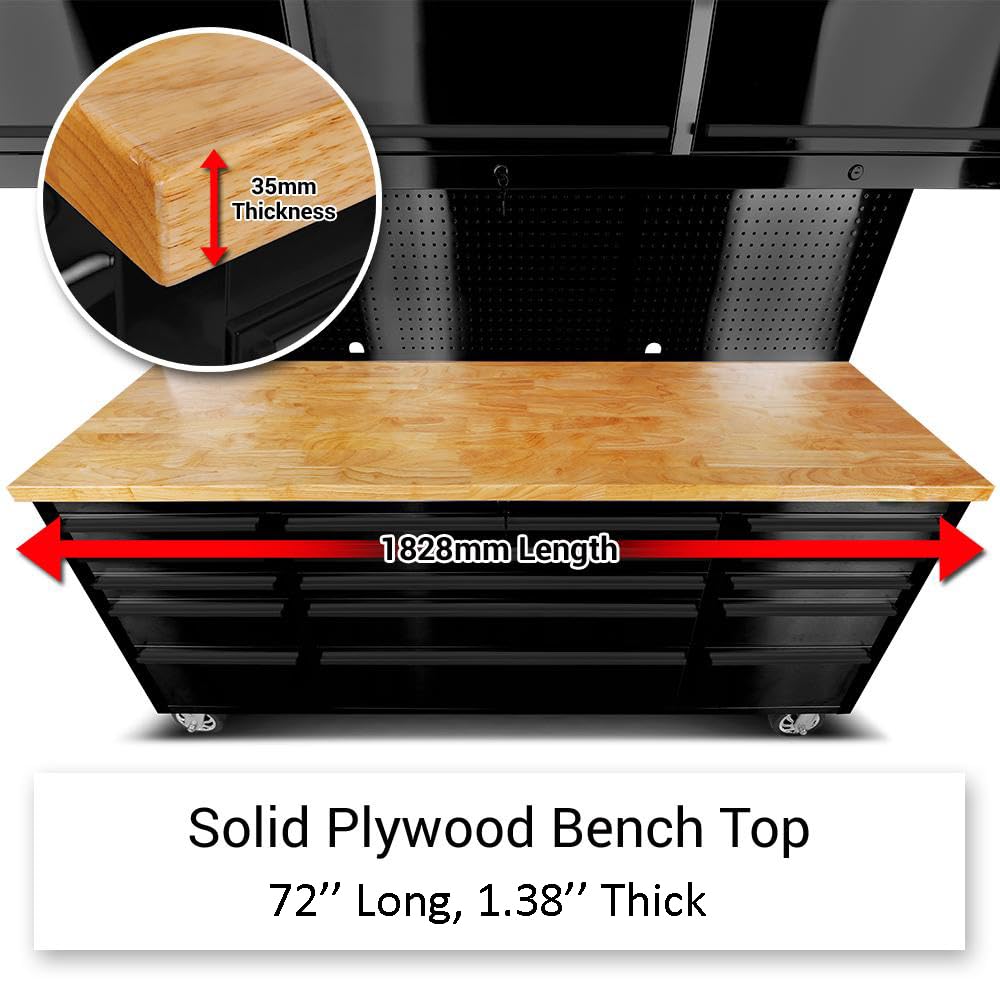 - 【LARGE STORAGE SPACE】: This 72-inch rolling tool chest with wheels comes with 15 drawers (5 large and 10 small), 3 wall-mount Upper Cabinet and pegboard. It has an 20.5-inch deep wooden top which provides a spacious working table, and can be used to organize your daily used tools.