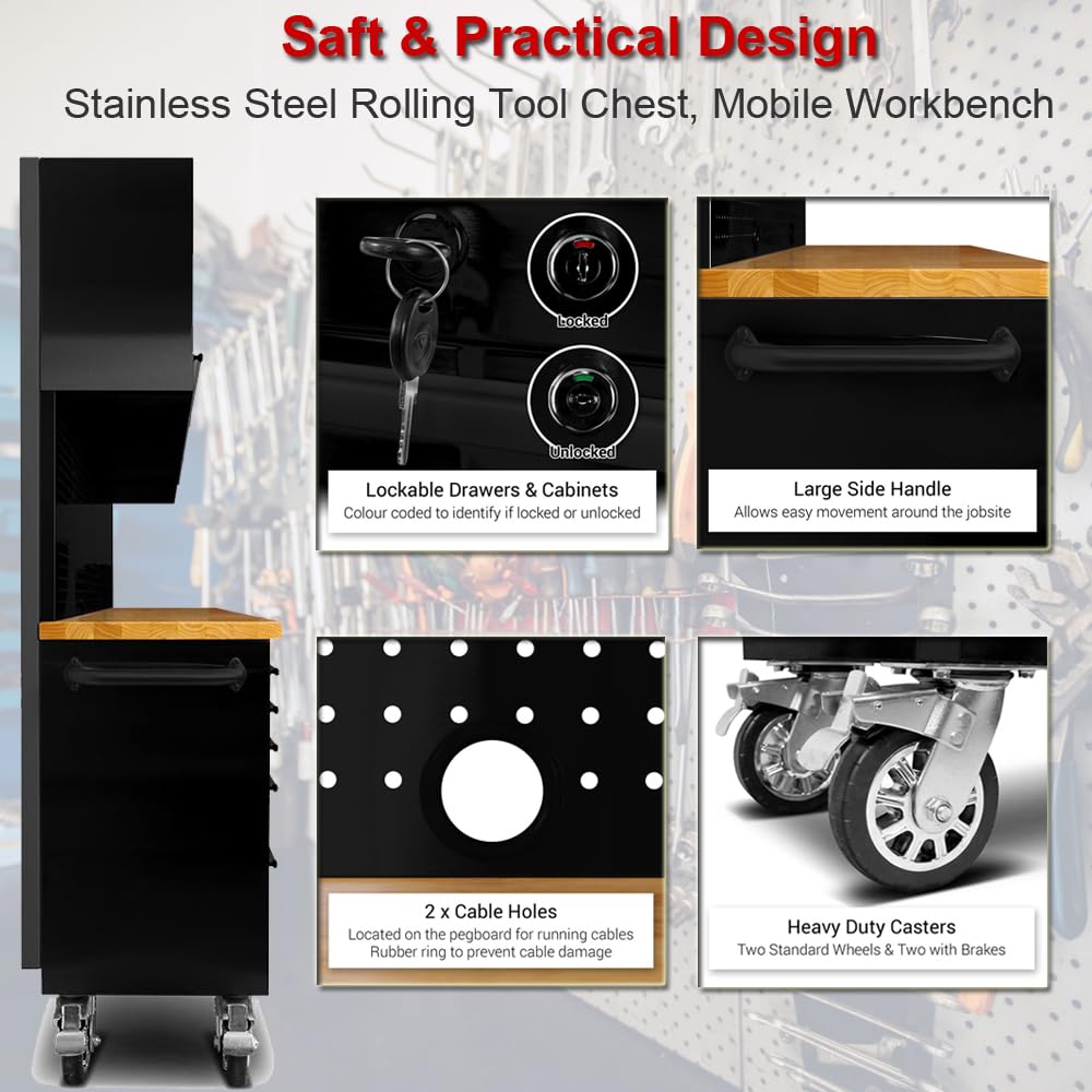 - 【SOLID CONSTRUCTION】: This tool chest on wheels is made from high quality 430 stainless steel, a 1.4-inch thick wood top adds strength and stability. It is also equipped with a lock and two keys, which ensures secure storage for your valuable tools and equipment, also prevent children from being curious and taking away tools.
