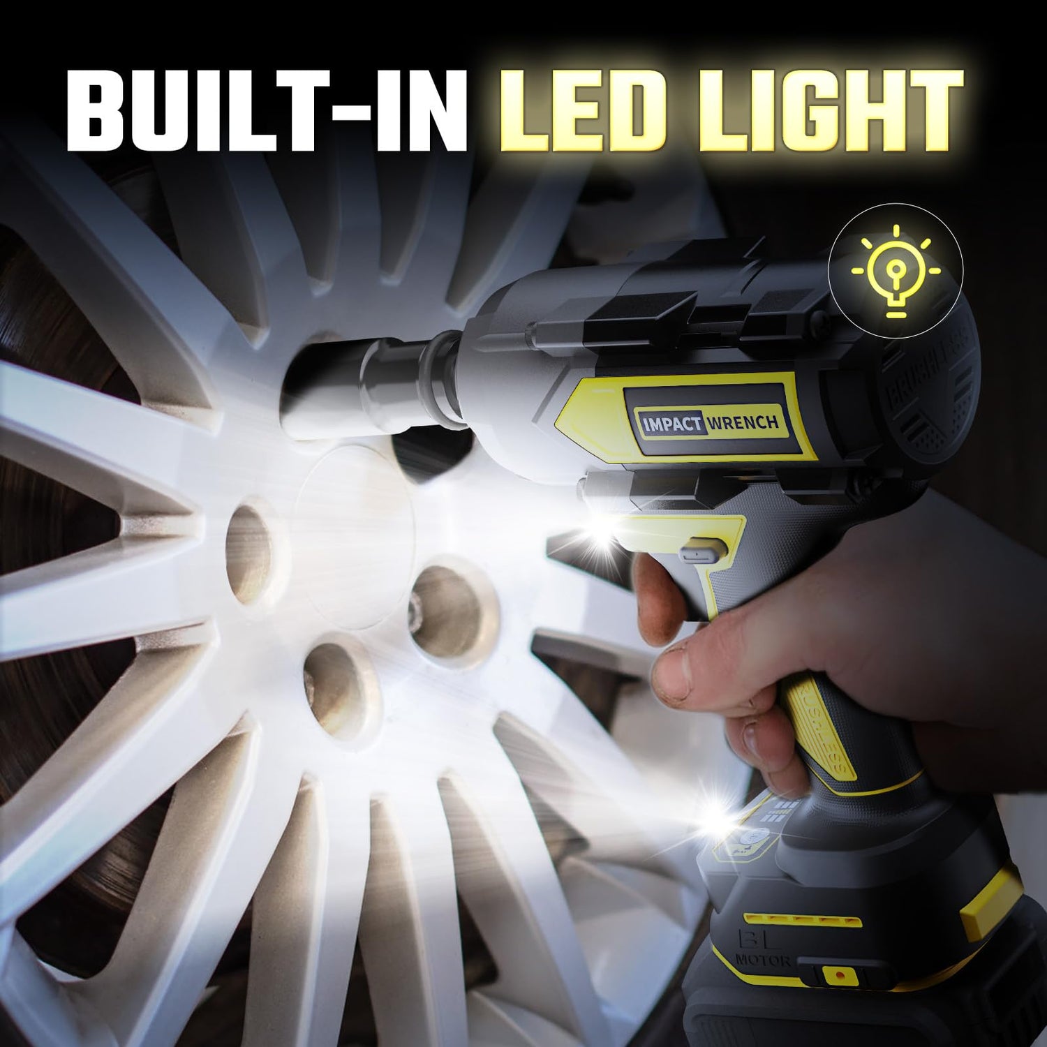 - LED Light & Brake Stop: The built-in 2 LED lights of this impact gun enhances visibility in dark working areas, and the reversing self-stop function ensures that the nut will not fall off easily when you remove it; Simply press and hold the trigger when you turn on this function, and the square driver will turn a few turns and then stop automatically