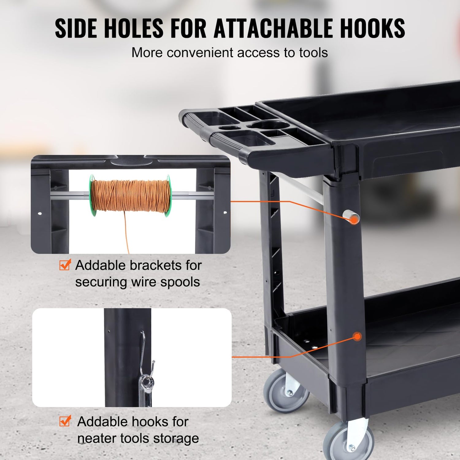 VEVOR Utility Service Cart, 2 Shelf 550LBS Heavy Duty Plastic Rolling Utility Cart, Medium Lipped Shelf, 360° Swivel Wheels, Ergonomic Storage Handle for Warehouse Garage, Black