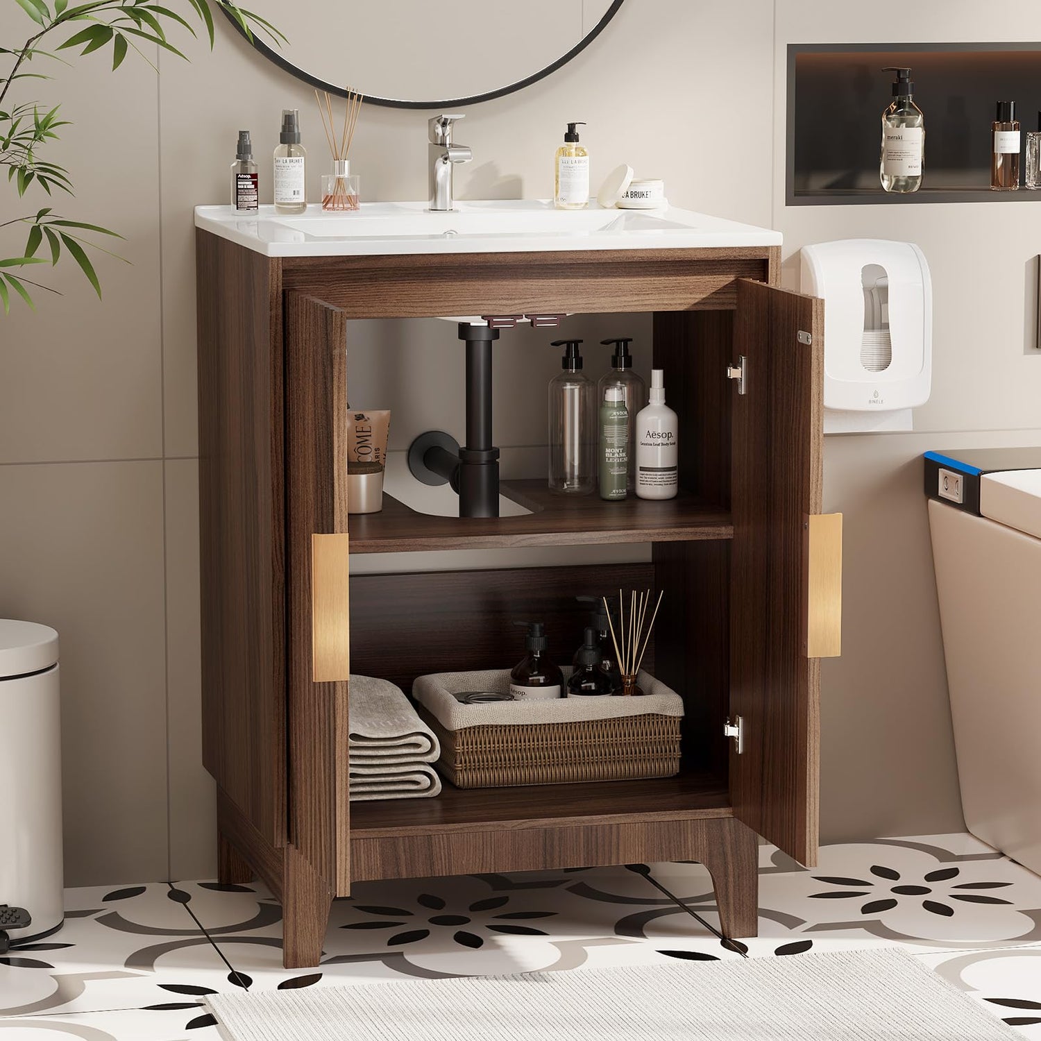 - 【Stylish Compact Design】: 24-inch walnut-colored fluted sink vanity combo, perfect for medium to small bathrooms, powder rooms, or guest bathrooms. The mid-century modern, space-saving design enhances the bathroom's style and ambiance.