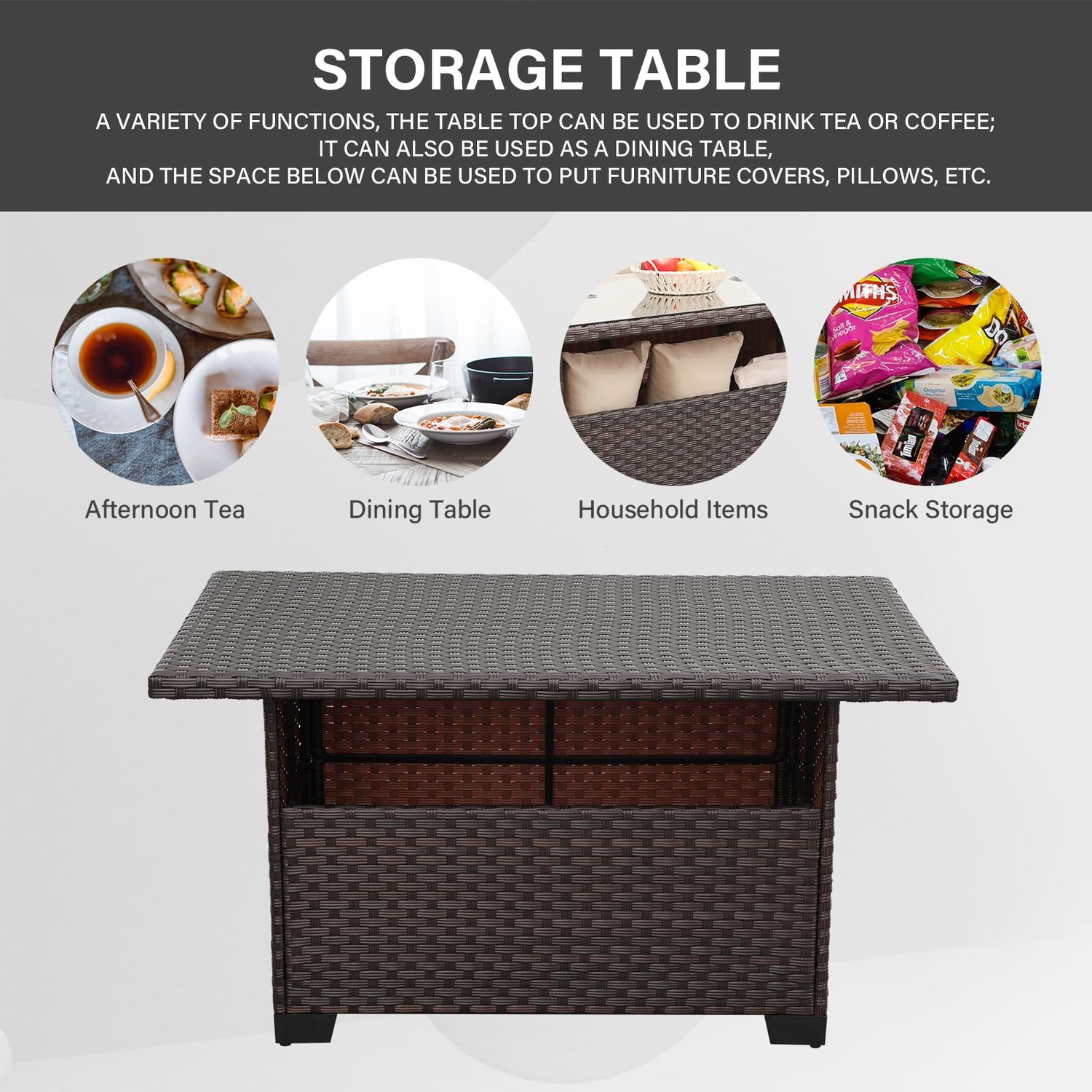 - Multi-function Table: Serving dual roles as both a coffee table and a dining table, the PP board top supports a strong load-bearing capacity. This patio table offers generous storage space for pillows, snacks, beverages, toys, and more
