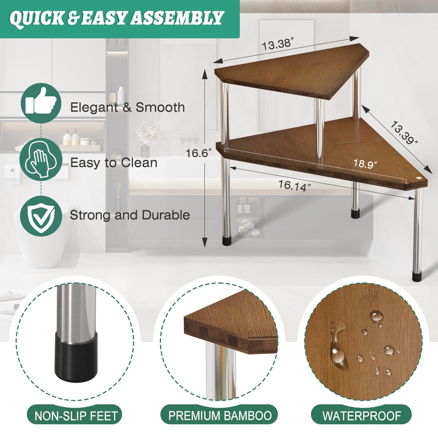 - MORE STEADY AND STABLE: Our bathroom counter organizer made of natural bamboo and stainless steel tubes makes this corner shelf more stable and durable, also add 3 rubber non-slip feet can protect your countertop surface better