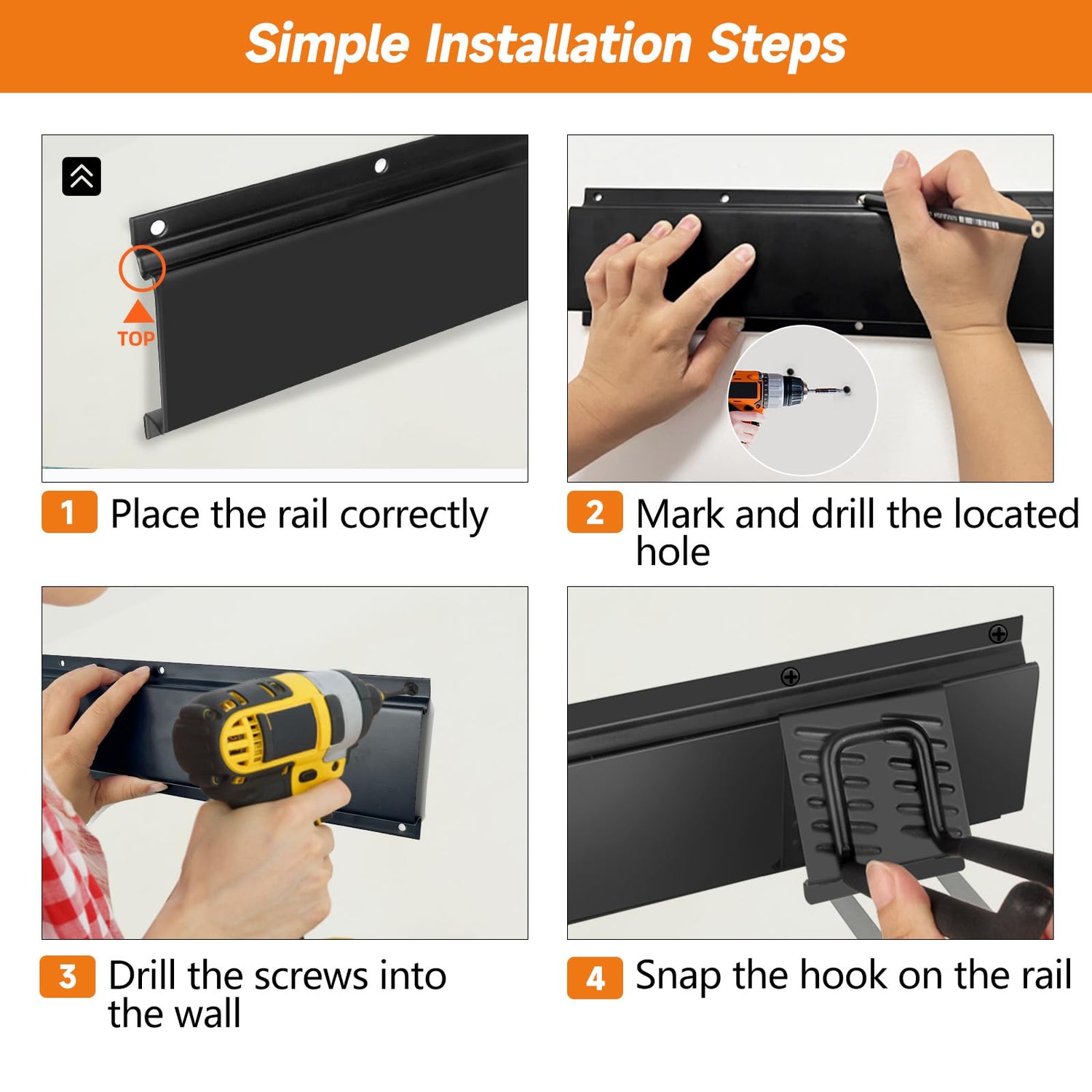 - Innovative Garage Tool Racks: Equipped With 3 Double-Layer Hooks, 3 Single Level hooks and 3 Rails, provides a reliable tool organizer wall mount solution, featuring durable carbon steel construction and multiple hanging options for effective organization