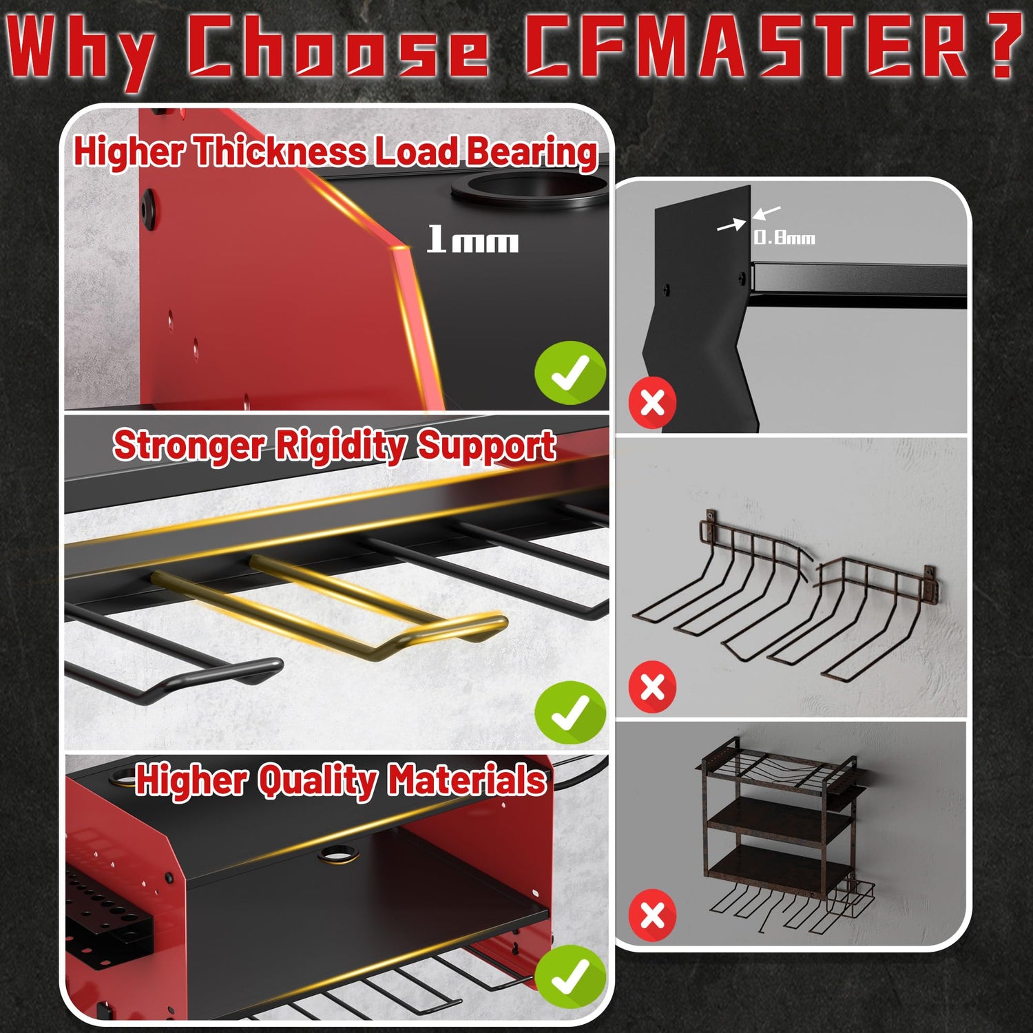 - 3 Layers Of Efficient Storage--16.4''L*11.8''W*11.8''H, can store most garage tools, the bottom shelf can store 4 cordless drills, the side pegs include drill holders, 3 long hooks, 6 short hooks, and the accessories can be mounted on the left and right side of the cordless tool rack as you choose.