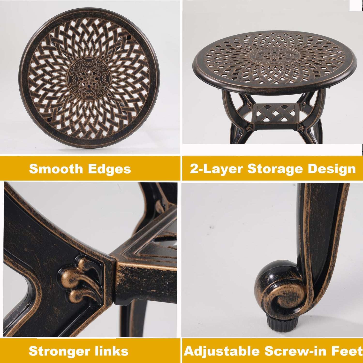 Details: Our whole outdoor side table is made of high quality cast aluminum, which is not only sturdy , but also not easy to rust. The four aluminum legs are specially connected to make the table more stable and have a stronger load-bearing capacity. The double storage design gives the outdoor end table more space. You can adjust the four screw-in legs to ensure that the small patio table stays stable even on uneven floors. Easy to assemble and easy to maintain, this table is a convenient addition to your home. Its charming vintage design adds a touch of elegance to any setting. Feature: Stylish outdoor side table with better craftsmanship and details Smooth edges protect you and your family Adjustable foot pads keep the table balanced Retro hollow pattern for timeless elegant Adequate storage space includes a spacious desktop and extra storage shelf Selected materials and sturdy structure for long-time use Water-proof surface is easy to clean and maintain Multifunctional table for balcony, poolside, backyard, porch and living room Quick assembly with the clear instruction Specification: Color: Black,Copper Material: Cast Aluminum Overall Dimensions: 21" x 21" x 19"/53 x 53 x 48 cm (L x W x H) Dimensions of Middle Shelf: 6.3" x 6.3"/16 x 16 cm (L x W) Space Between Tabletop and Shelf: 7.7"/19.5 cm Space Between Shelf and Ground: 10"/25.5 cm Weight Capacity: 220 lbs/ 100 kg Net Weight: 4 kg/9 lbs Package Includes: 1 x Cast Aluminum Table 1 x Instruction 1 xScrew package