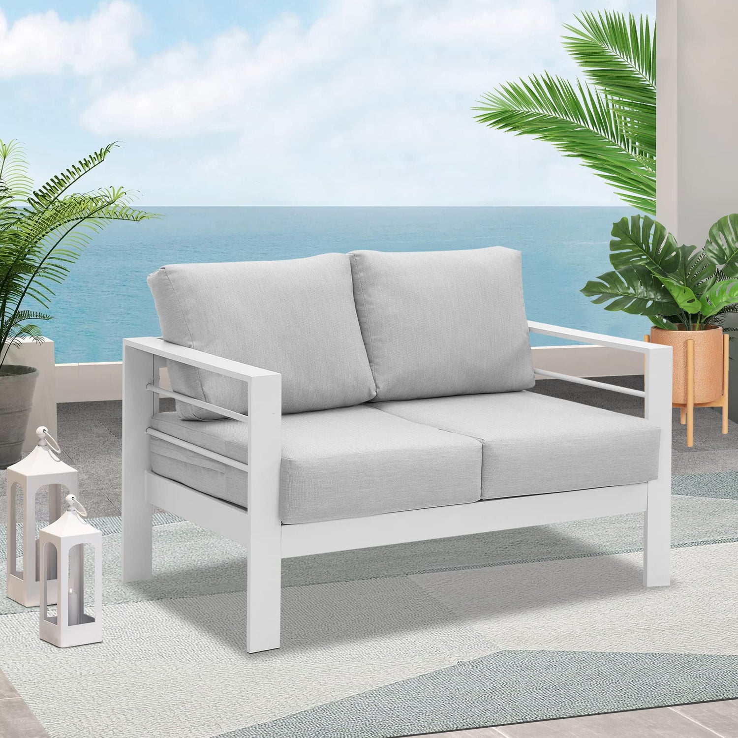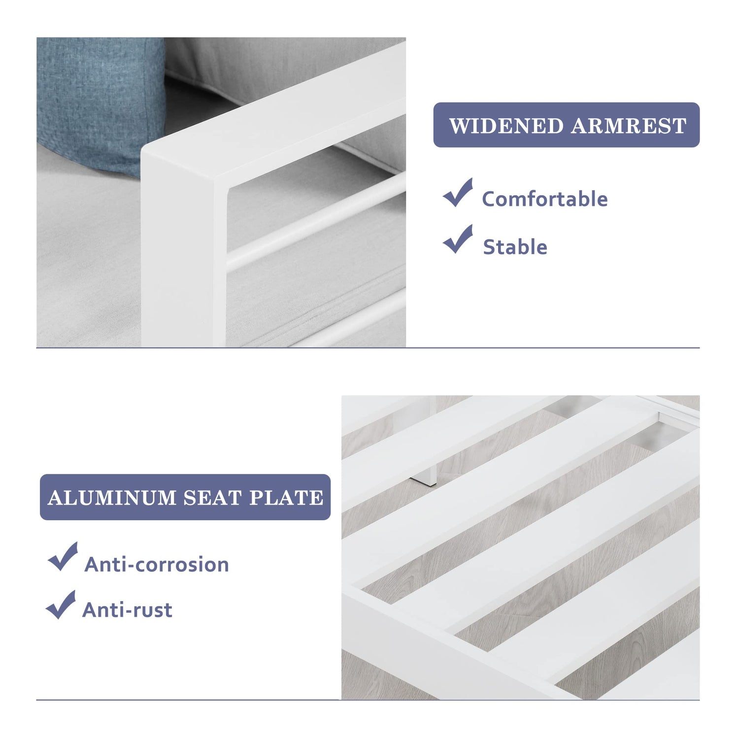 - RICH in DETAILS- Crafted from fully seam welded and rust-proof screws, which gives the modern aluminum outdoor patio furniture flexible, impact-, and crack-resistant qualities. Durable welds and strong screws give our loveseat a solid frame and sturdy feel. Plus, the 4 aluminum legs are protected by plastic feet to prevent abrasion and sharp scrapes.