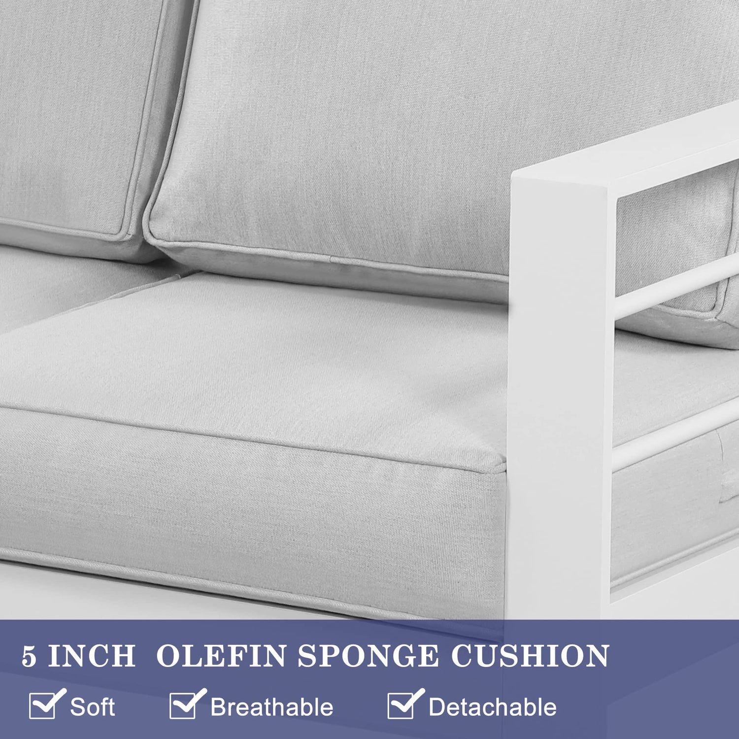 - 5-INCH OLEFIN CUSHION- Covering the top of the aluminum outdoor sofa baseplate, piped cushions provide 5-INCH padding as you sit. Thickened at the waist, the foam-filled cushions encourage proper posture while you sit. Each cushion of the patio furniture loveseat is wrapped in water-repellent OLEFIN fabric, so it's sure to stand up to UV rays beaming down when left outdoors.