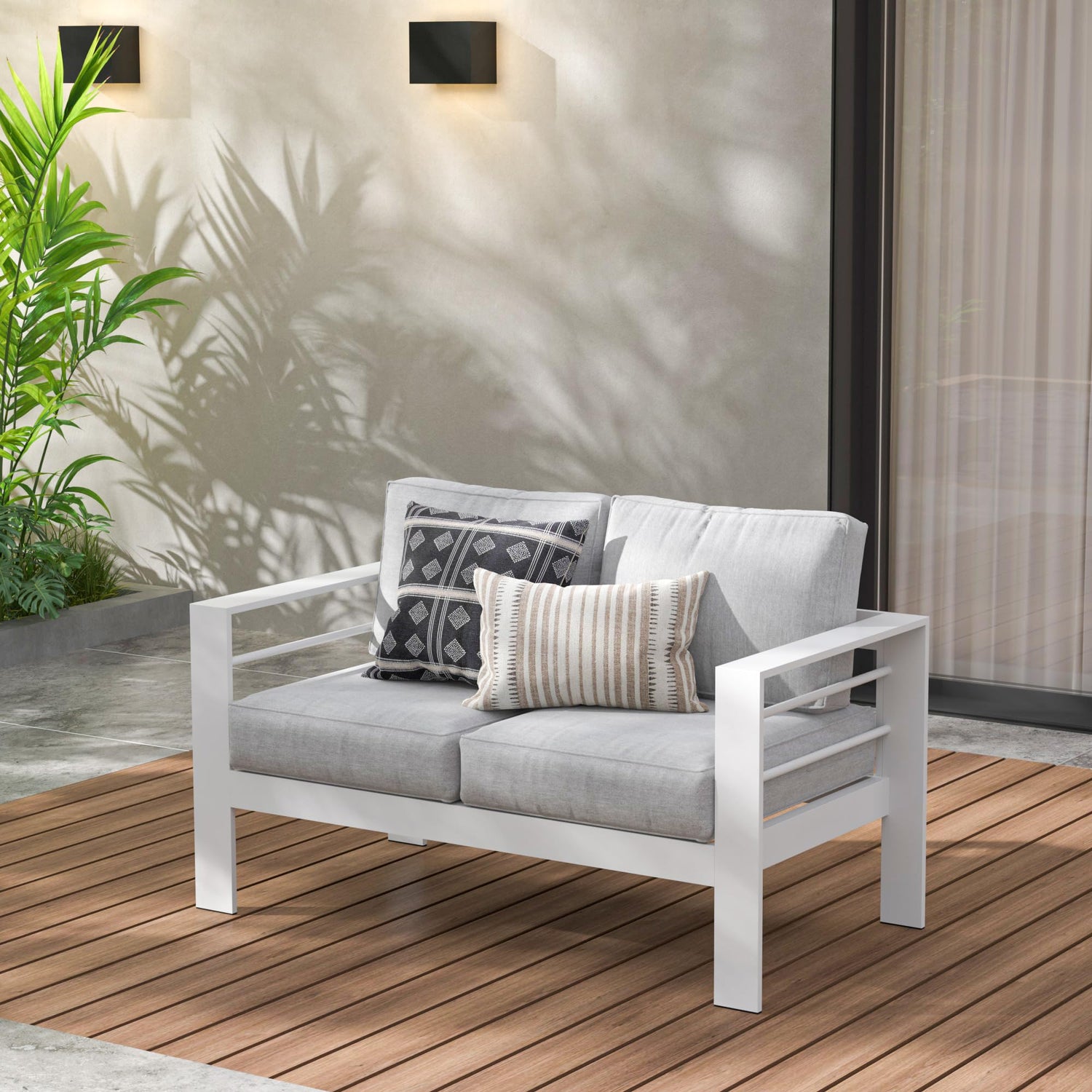 Wisteria Lane Patio Furniture Aluminum Loveseat, All-Weather Outdoor 2 Seats Sofa Couch, White Metal Chair with Light Grey Cushions