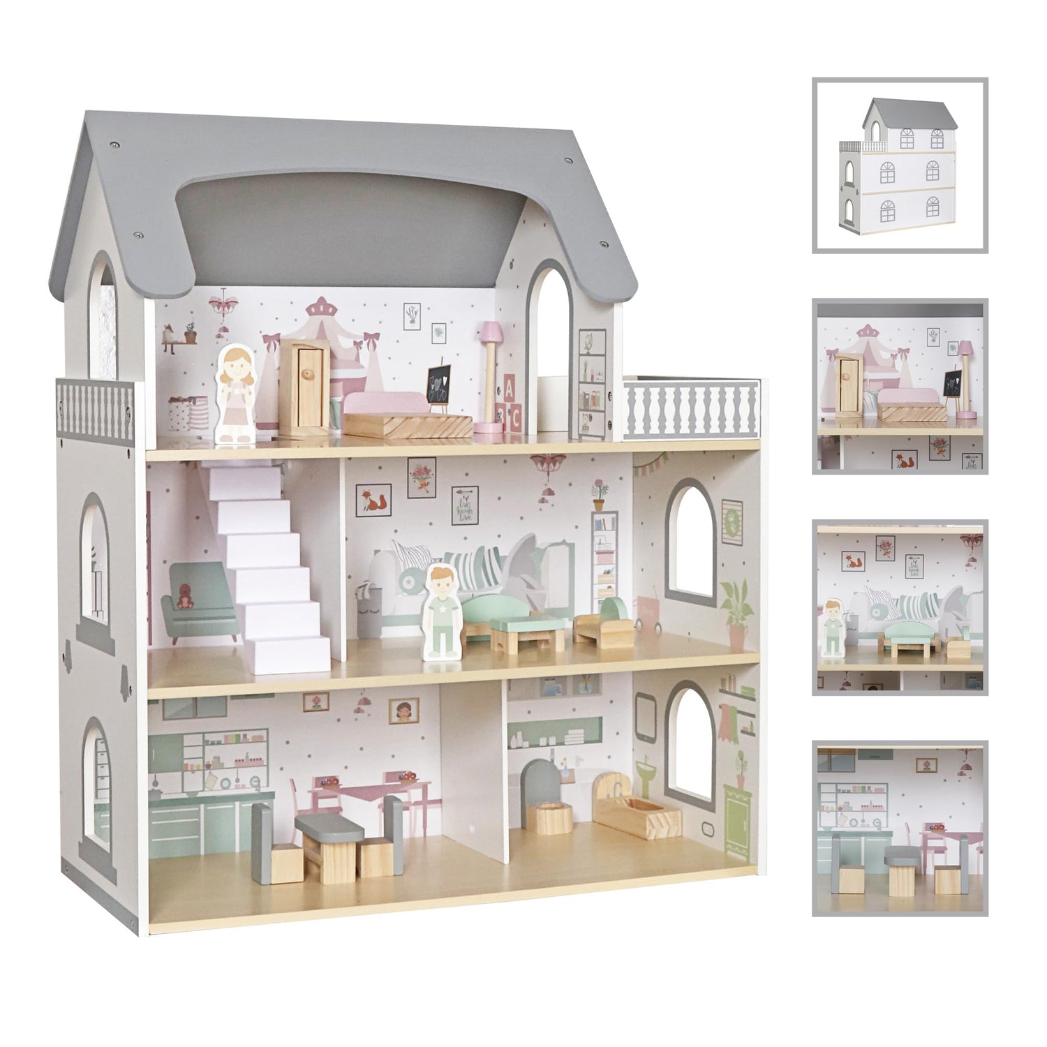 - 🎄 Simulated Design - Three-level doll houses with a spacious terrace and four rooms - kitchen, bathroom, living room and bedroom - it is equipped with detailed wooden furniture that adds charms.