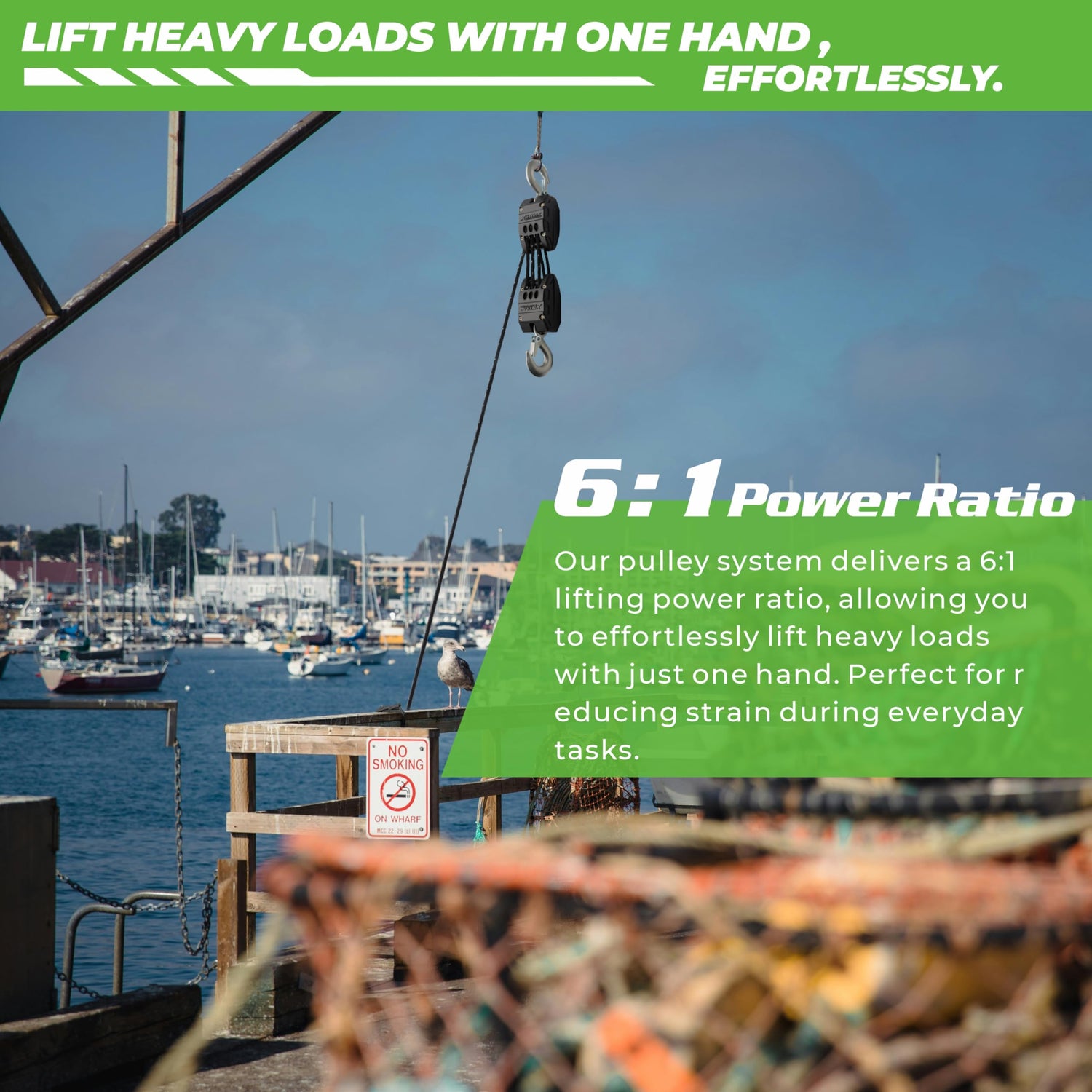 - 5:1 LIFTING POWER & 1000LB CAPACITY: Heavy-duty block and tackle pulley system delivers 5:1 mechanical advantage, allowing single-handed lifting of heavy loads (Up to 1000LB working load / 2000LB breaking strength). Perfect for garage, construction, deer hoisting, tree cutting, and DIY attic lifts without electricity