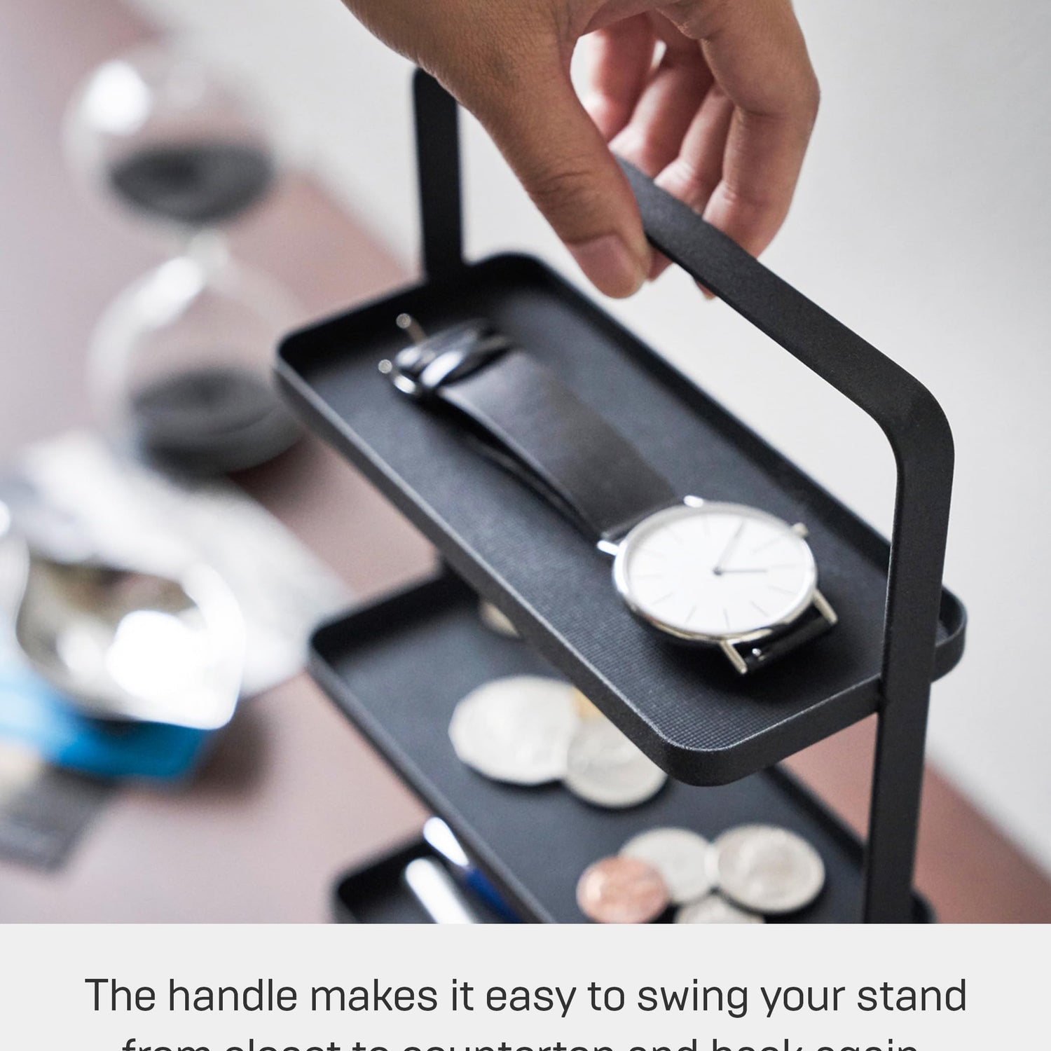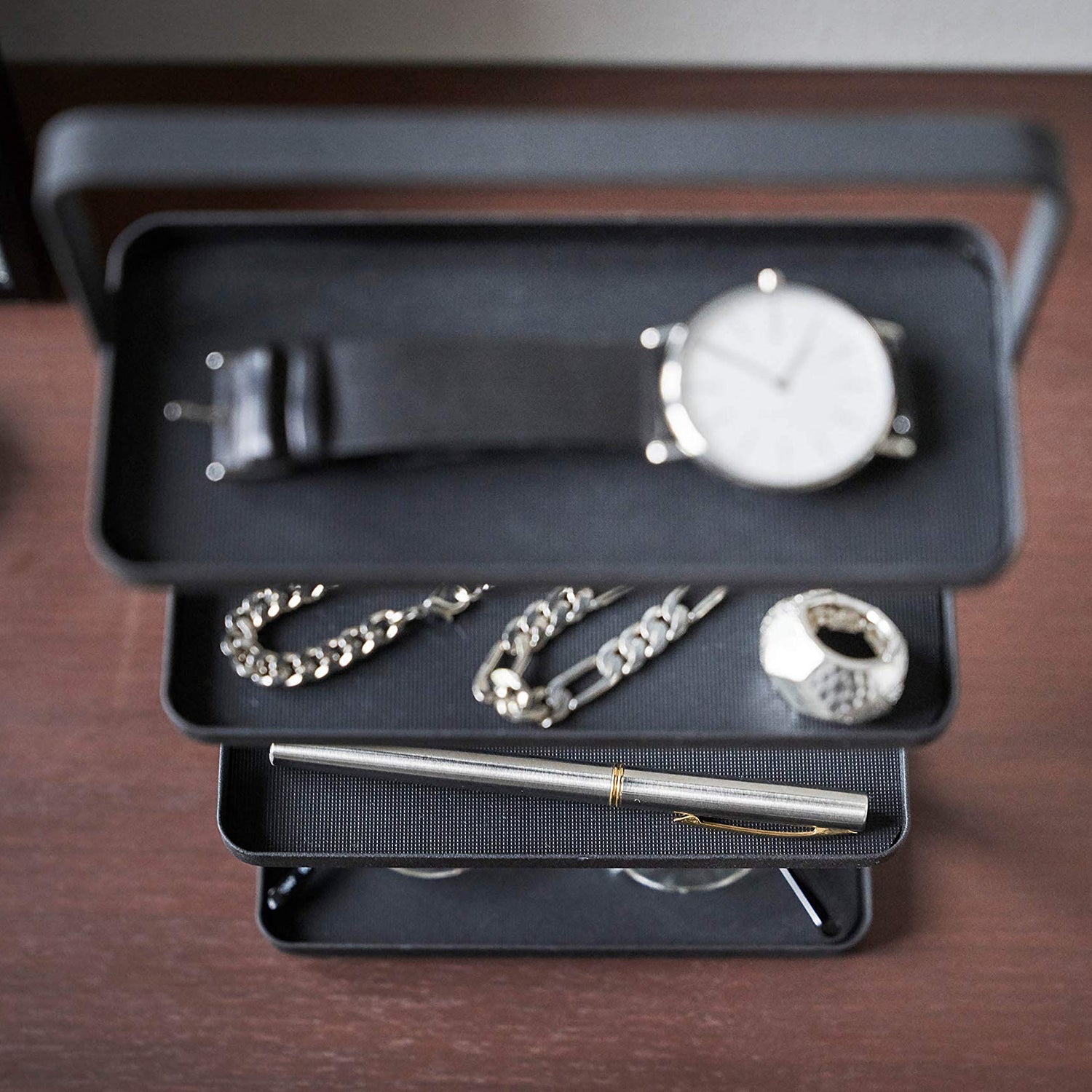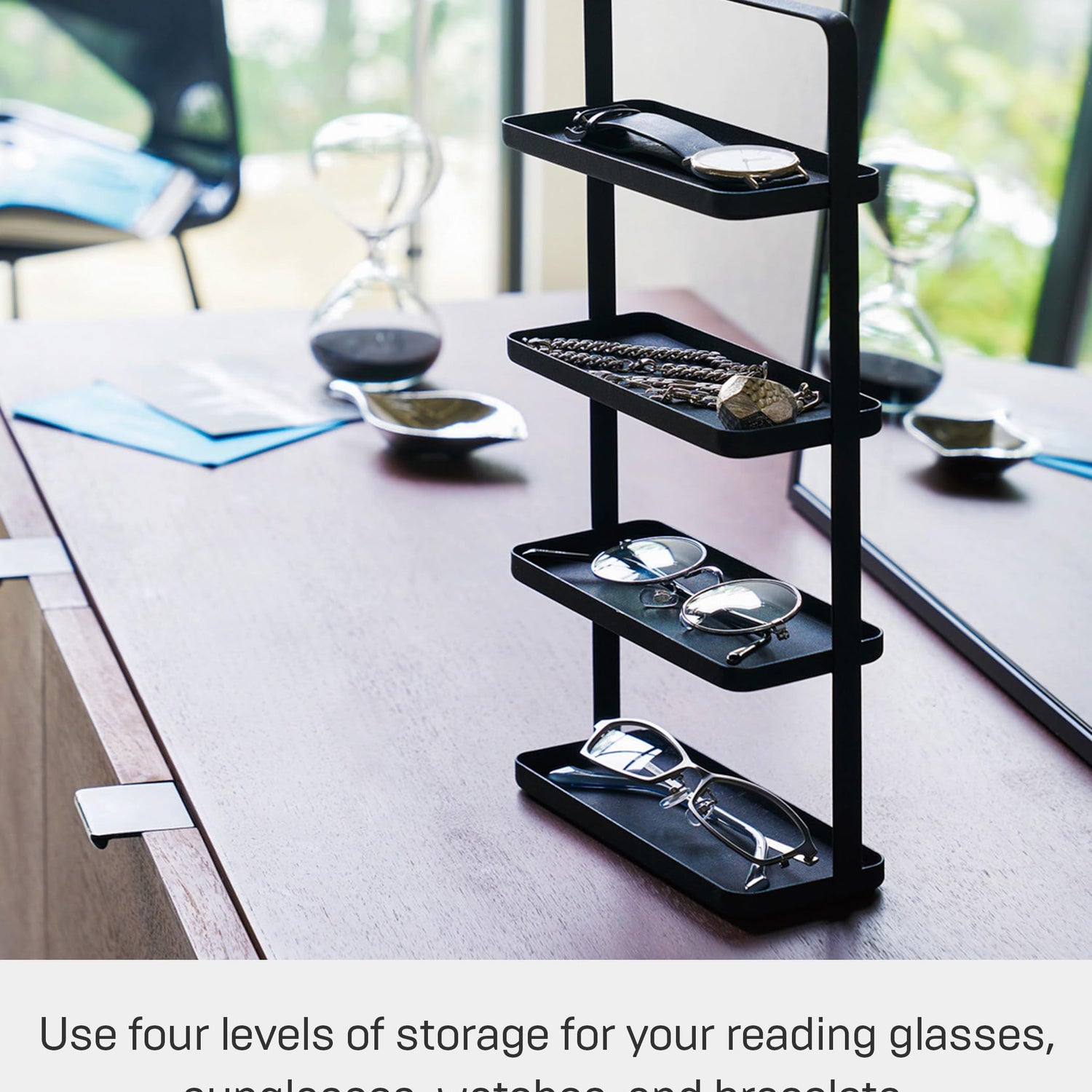 - [4-tiered accessory tray for jewelry items like bracelets, necklaces, rings, watches, rings, glasses and other small accessories.] Place in the bedroom or bathroom to stay organized.